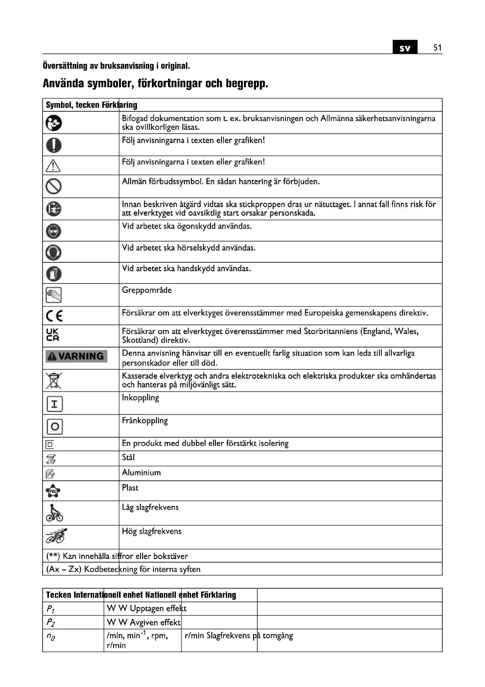 Översättning av bruksanvisning i original. Använda symboler, förkortningar och begrepp. Symbol, tecken Förklaring Bifogad dokumentation som t. ex. bruksanvisningen och Allmänna säkerhetsanvisningarna ska ovillkorligen läsas. Följ anvisningarna i texten eller grafiken! Följ anvisningarna i texten eller grafiken! Allmän förbudssymbol. En sådan hantering är förbjuden. Innan beskriven åtgärd vidtas ska stickproppen dras ur nätuttaget. I annat fall finns risk för att elverktyget vid oavsiktlig start orsakar personskada. Vid arbetet ska ögonskydd användas. Vid arbetet ska hörselskydd användas. Vid arbetet ska handskydd användas. Greppområde Försäkrar om att elverktyget överensstämmer med Europeiska gemenskapens direktiv. Försäkrar om att elverktyget överensstämmer med Storbritanniens (England, Wales, Skottland) direktiv. Denna anvisning hänvisar till en eventuellt farlig situation som kan leda till allvarliga personskador eller till död. Kasserade elverktyg och andra elektrotekniska och elektriska produkter ska omhändertas och hanteras på miljövänligt sätt. Inkoppling Frånkoppling En produkt med dubbel eller förstärkt isolering Stål Aluminium Plast Låg slagfrekvens Hög slagfrekvens (**) Kan innehålla siffror eller bokstäver (Ax – Zx) Kodbeteckning för interna syften Tecken Internationell enhet Nationell enhet Förklaring