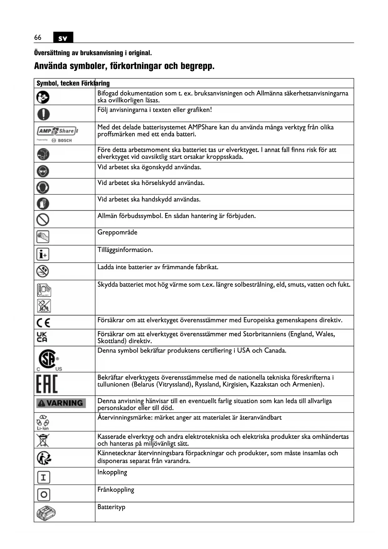 Översättning av bruksanvisning i original. Använda symboler, förkortningar och begrepp. Symbol, tecken Förklaring Bifogad dokumentation som t. ex. bruksanvisningen och Allmänna säkerhetsanvisningarna ska ovillkorligen läsas. Följ anvisningarna i texten eller grafiken! Med det delade batterisystemet AMPShare kan du använda många verktyg från olika proffsmärken med ett enda batteri. Före detta arbetsmoment ska batteriet tas ur elverktyget. I annat fall finns risk för att elverktyget vid oavsiktlig start orsakar kroppsskada. Vid arbetet ska ögonskydd användas. Vid arbetet ska hörselskydd användas. Vid arbetet ska handskydd användas. Allmän förbudssymbol. En sådan hantering är förbjuden. Greppområde Tilläggsinformation. Ladda inte batterier av främmande fabrikat. Skydda batteriet mot hög värme som t.ex. längre solbestrålning, eld, smuts, vatten och fukt. Försäkrar om att elverktyget överensstämmer med Europeiska gemenskapens direktiv. Försäkrar om att elverktyget överensstämmer med Storbritanniens (England, Wales, Skottland) direktiv. Denna symbol bekräftar produktens certifiering i USA och Canada. Bekräftar elverktygets överensstämmelse med de nationella tekniska föreskrifterna i tullunionen (Belarus (Vitryssland), Ryssland, Kirgisien, Kazakstan och Armenien). Denna anvisning hänvisar till en eventuellt farlig situation som kan leda till allvarliga personskador eller till död. Återvinningsmärke: märket anger att materialet är återanvändbart Kasserade elverktyg och andra elektrotekniska och elektriska produkter ska omhändertas och hanteras på miljövänligt sätt. Kännetecknar återvinningsbara förpackningar och produkter, som måste insamlas och disponeras separat från varandra. Inkoppling Frånkoppling Batterityp max.50°C67