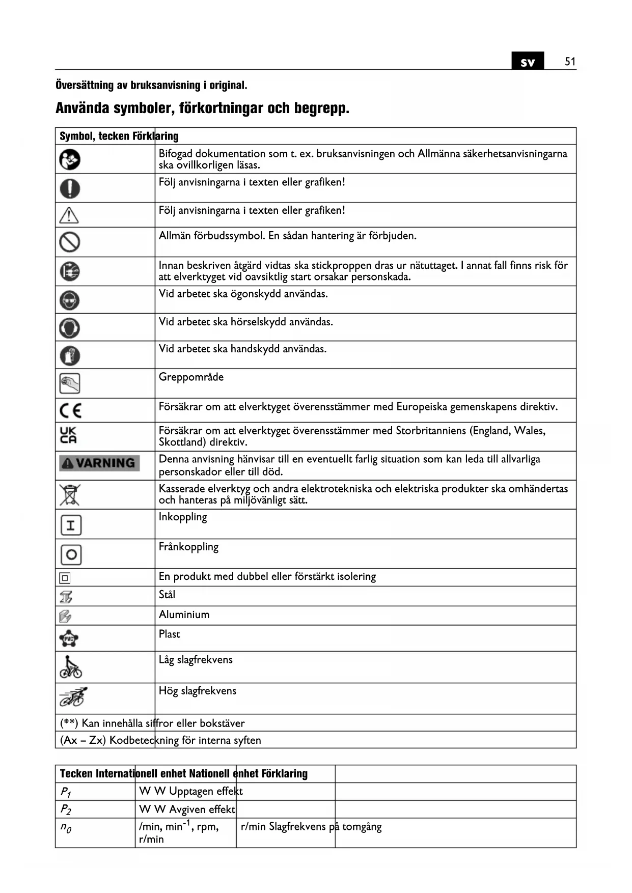 Översättning av bruksanvisning i original. Använda symboler, förkortningar och begrepp. Symbol, tecken Förklaring Bifogad dokumentation som t. ex. bruksanvisningen och Allmänna säkerhetsanvisningarna ska ovillkorligen läsas. Följ anvisningarna i texten eller grafiken! Följ anvisningarna i texten eller grafiken! Allmän förbudssymbol. En sådan hantering är förbjuden. Innan beskriven åtgärd vidtas ska stickproppen dras ur nätuttaget. I annat fall finns risk för att elverktyget vid oavsiktlig start orsakar personskada. Vid arbetet ska ögonskydd användas. Vid arbetet ska hörselskydd användas. Vid arbetet ska handskydd användas. Greppområde Försäkrar om att elverktyget överensstämmer med Europeiska gemenskapens direktiv. Försäkrar om att elverktyget överensstämmer med Storbritanniens (England, Wales, Skottland) direktiv. Denna anvisning hänvisar till en eventuellt farlig situation som kan leda till allvarliga personskador eller till död. Kasserade elverktyg och andra elektrotekniska och elektriska produkter ska omhändertas och hanteras på miljövänligt sätt. Inkoppling Frånkoppling En produkt med dubbel eller förstärkt isolering Stål Aluminium Plast Låg slagfrekvens Hög slagfrekvens (**) Kan innehålla siffror eller bokstäver (Ax – Zx) Kodbeteckning för interna syften Tecken Internationell enhet Nationell enhet Förklaring