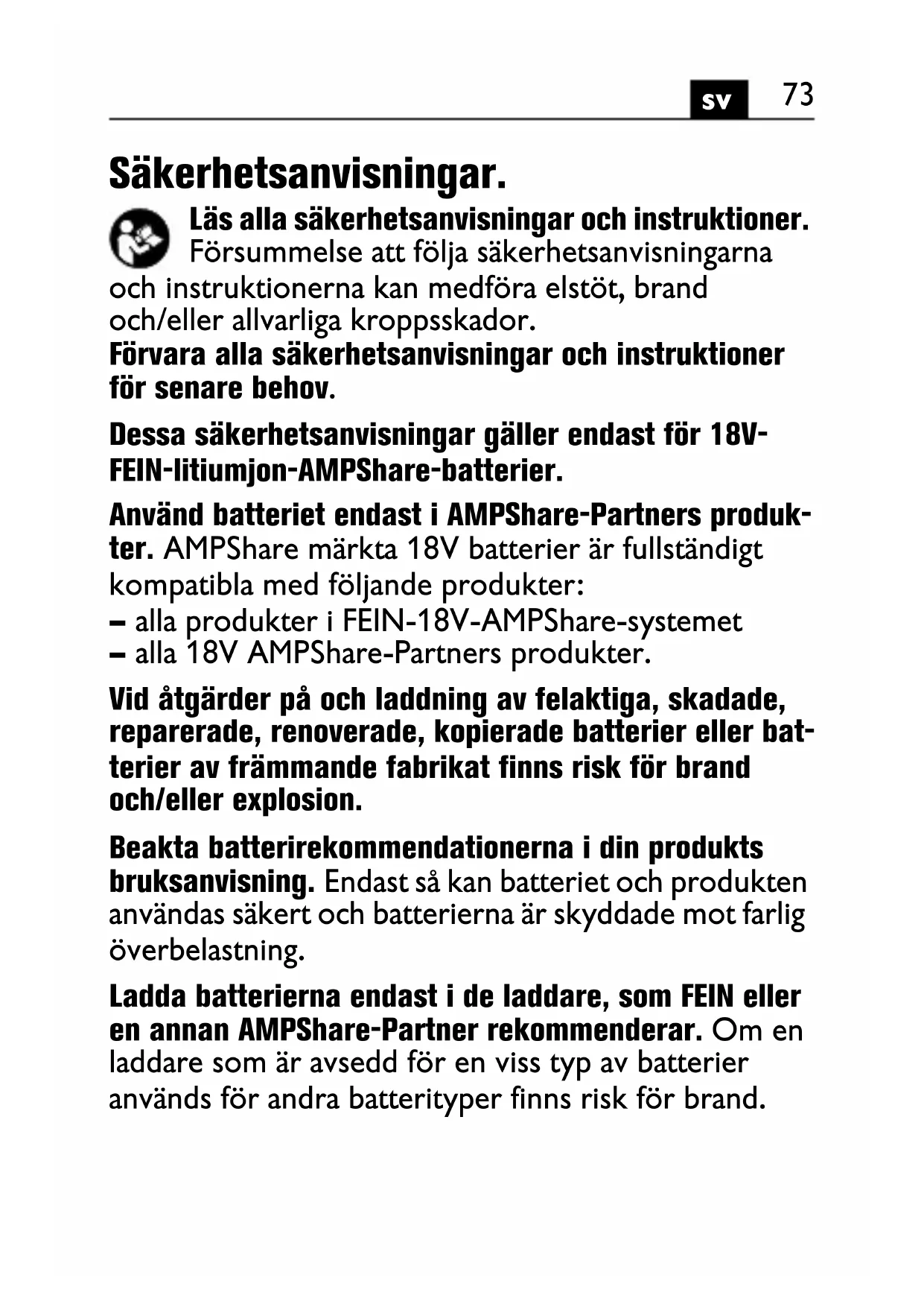 Säkerhetsanvisningar. Läs alla säkerhetsanvisningar och instruktioner. Försummelse att följa säkerhetsanvisningarna och instruktionerna kan medföra elstöt, brand och/eller allvarliga kroppsskador. Förvara alla säkerhetsanvisningar och instruktioner för senare behov. Dessa säkerhetsanvisningar gäller endast för 18V- FEIN-litiumjon-AMPShare-batterier. Använd batteriet endast i AMPShare-Partners produk- ter. AMPShare märkta 18V batterier är fullständigt kompatibla med följande produkter: – alla produkter i FEIN-18V-AMPShare-systemet – alla 18V AMPShare-Partners produkter. Vid åtgärder på och laddning av felaktiga, skadade, reparerade, renoverade, kopierade batterier eller bat- terier av främmande fabrikat finns risk för brand och/eller explosion. Beakta batterirekommendationerna i din produkts bruksanvisning. Endast så kan batteriet och produkten användas säkert och batterierna är skyddade mot farlig överbelastning. Ladda batterierna endast i de laddare, som FEIN eller en annan AMPShare-Partner rekommenderar. Om en laddare som är avsedd för en viss typ av batterier används för andra batterityper finns risk för brand.74