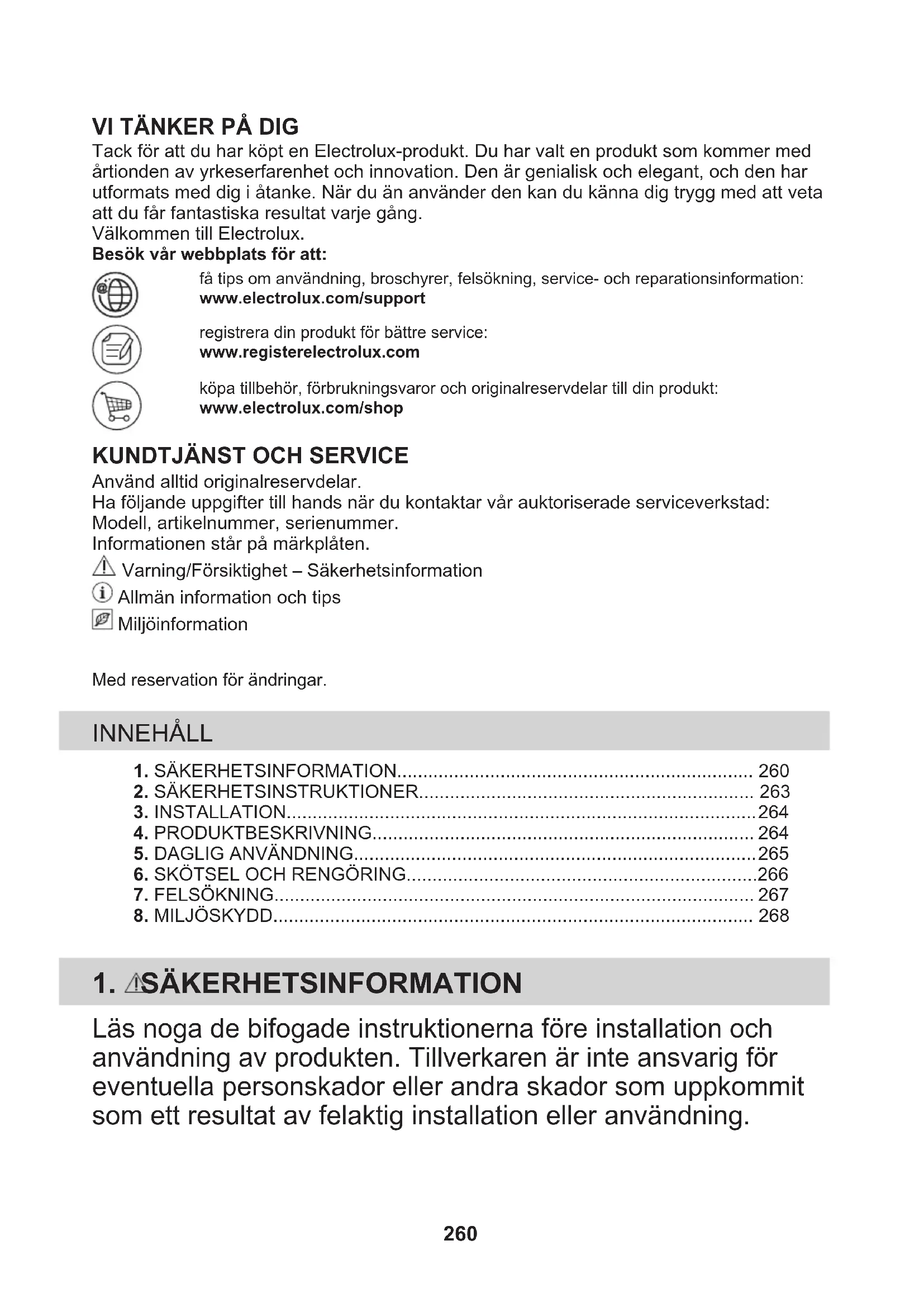 Tack för att du har köpt en Electrolux-produkt. Du har valt en produkt som kommer medårtionden av yrkeserfarenhet och innovation. Den är genialisk och elegant, och den harutformats med dig i åtanke. När du än använder den kan du känna dig trygg med att vetaatt du får fantastiska resultat varje gång.Välkommen till Electrolux.Besök vår webbplats för att:få tips om användning, broschyrer, felsökning, service- och reparationsinformation:www.electrolux.com/supportregistrera din produkt för bättre service:www.registerelectrolux.comköpa tillbehör, förbrukningsvaror och originalreservdelar till din produkt:www.electrolux.com/shop