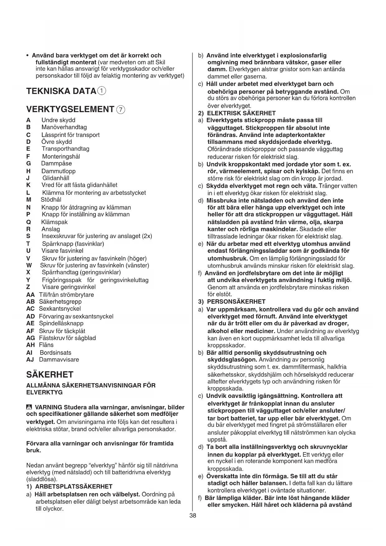 A Undre skydd B Manöverhandtag C Låssprint för transport D Övre skydd E Transporthandtag F Monteringshål G Dammpåse H Dammutlopp J Glidanhåll K Vred för att fästa glidanhållet L Klämma för montering av arbetsstycket M Stödhål N Knapp för åtdragning av klämman P Knapp för inställning av klämman Q Klämspak R Anslag S Insexskruvar för justering av anslaget (2x) T Spärrknapp (fasvinklar) U Visare fasvinkel V Skruv för justering av fasvinkeln (höger) W Skruv för justering av fasvinkeln (vänster) X Spärrhandtag (geringsvinklar) Y Frigöringsspak för geringsvinkeluttag Z Visare geringsvinkel AA Till/från strömbrytare AB Säkerhetsgrepp AC Sexkantsnyckel AD Förvaring av sexkantsnyckel AE Spindellåsknapp AF Skruv för täckplåt AG Fästskruv för sågblad AH Fläns AI Bordsinsats AJ Dammavvisare SÄKERHET