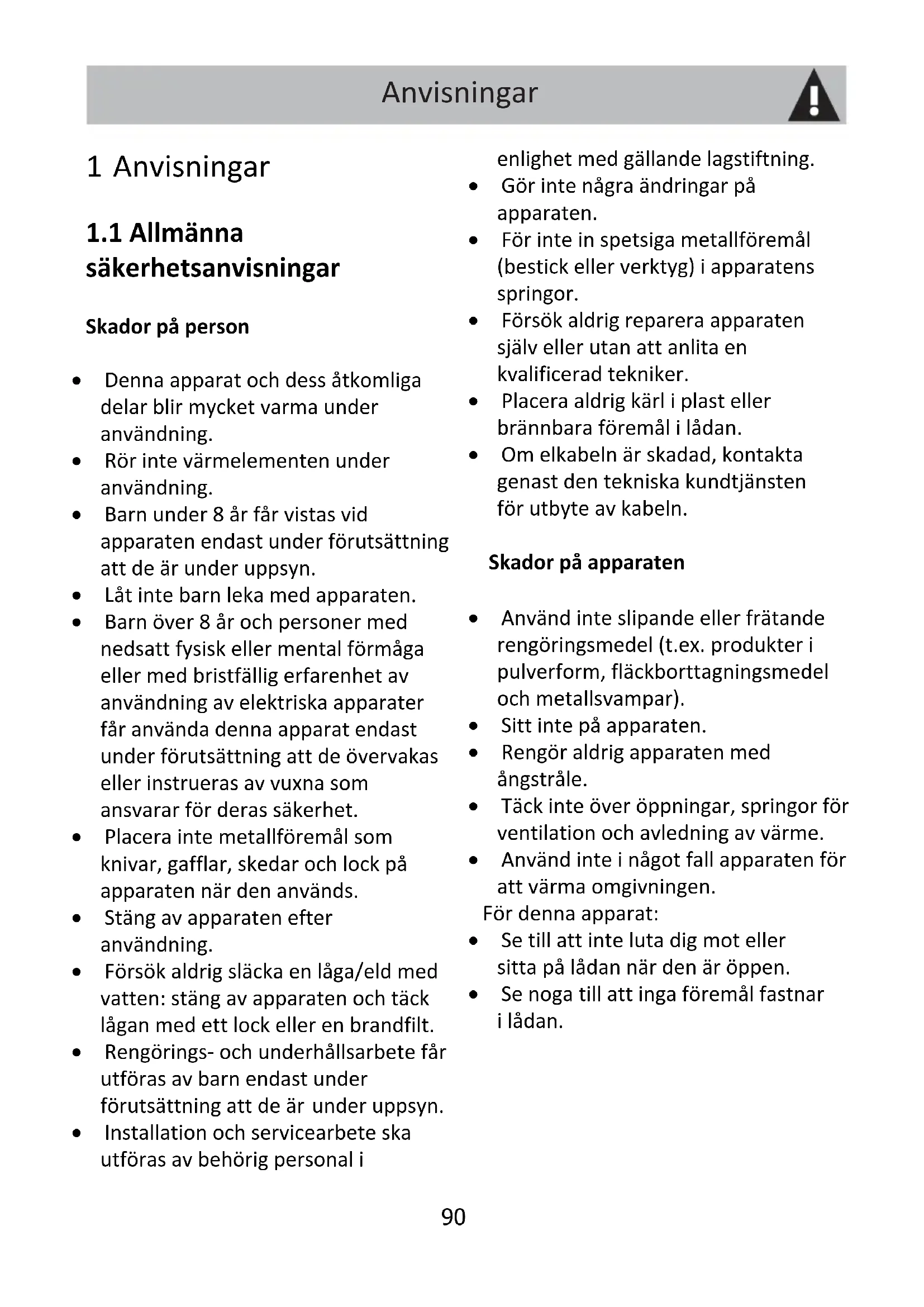 - Se noga till att inga föremål fastnar i lådan. Anvisningar91