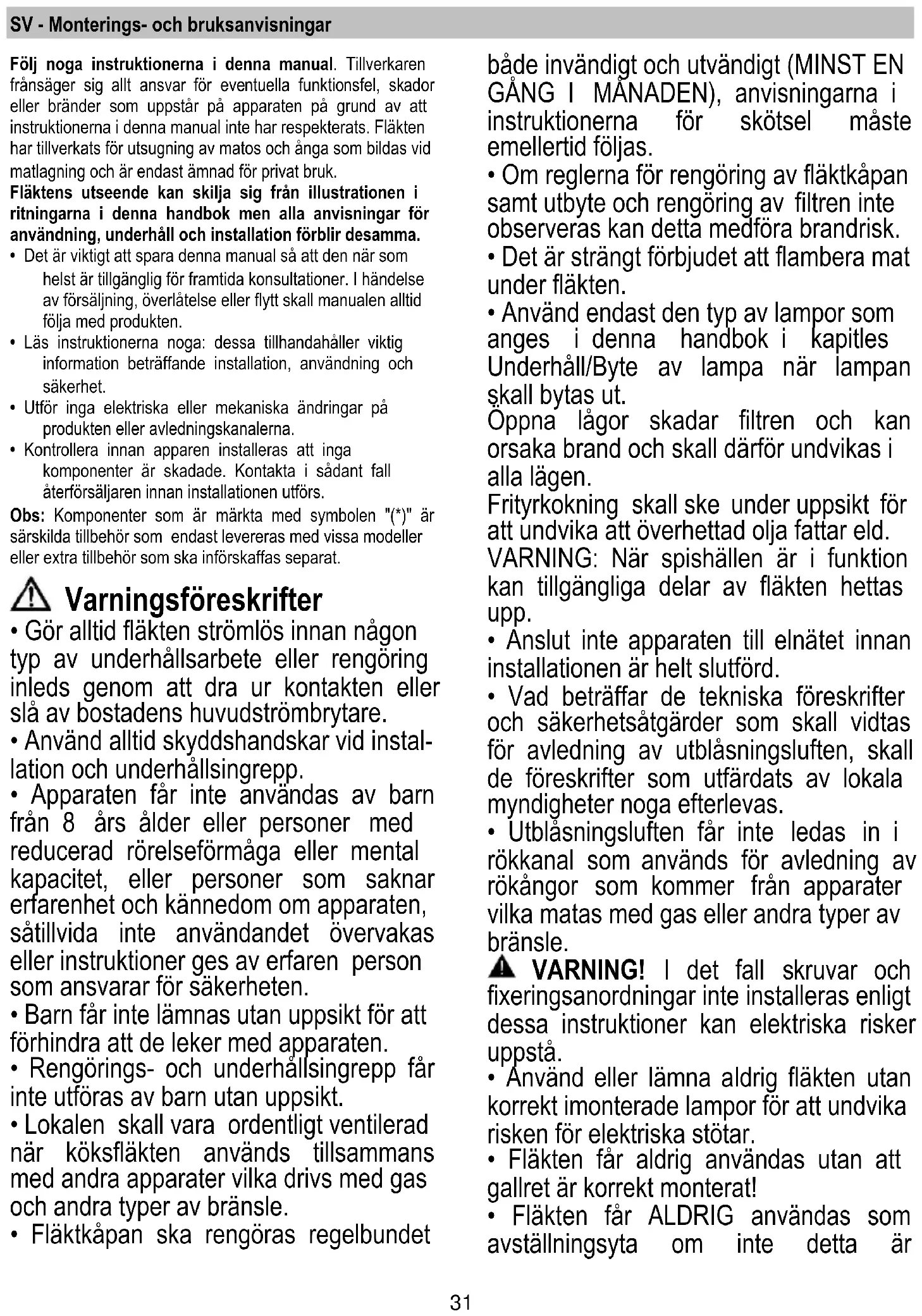 SÓ para alguns produtos: Como opção, será fornecida uma Válvula de Anti-Retorno dos Fumos para ser instalada. Se as condições de instalação o exigirem (se, por exemplo, não existir qualquer protecção contra a passagem acidental do ar de fora para dentro), inserir a válvula no alojamento previsto que se encontra no interior da Ligação de Saída do Ar antes de instalar o tubo de exaustão. Fig. 1531 SV - Monterings- och bruksanvisningar Följ noga instruktionerna i denna manual. Tillverkaren frånsäger sig allt ansvar för eventuella funktionsfel, skador eller bränder som uppstår på apparaten på grund av att instruktionerna i denna manual inte har respekterats. Fläkten har tillverkats för utsugning av matos och ånga som bildas vid matlagning och är endast ämnad för privat bruk. Fläktens utseende kan skilja sig från illustrationen i ritningarna i denna handbok men alla anvisningar för användning, underhåll och installation förblir desamma.