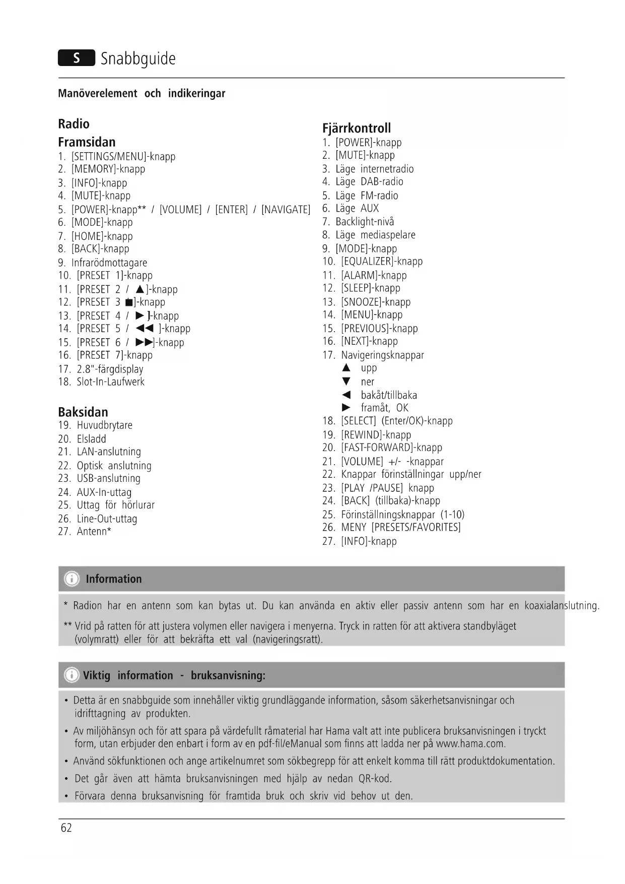 - Radion har en antenn som kan bytas ut. Du kan använda en aktiv eller passiv antenn som har en koaxialanslutning. ** Vrid på ratten för att justera volymen eller navigera i menyerna. Tryck in ratten för att aktivera standbyläget (volymratt) eller för att bekräfta ett val (navigeringsratt). Viktig information - bruksanvisning: