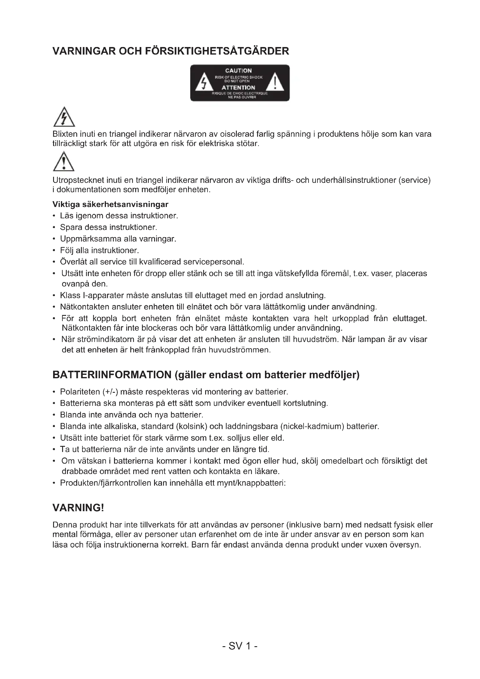 - Produkten/fjärrkontrollen kan innehålla ett mynt/knappbatteri: VARNING! Denna produkt har inte tillverkats för att användas av personer (inklusive barn) med nedsatt fysisk eller mental förmåga, eller av personer utan erfarenhet om de inte är under ansvar av en person som kan läsa och följa instruktionerna korrekt. Barn får endast använda denna produkt under vuxen översyn.- SV 2 - VARNING RÖRANDE BATTERIER! Svälj inte batterierna Risk för kemiska brännskador Denna produkt innehåller ett eller era batterier. Om ett batteri sväljs kan det inom mindre än två timmar orsaka allvarliga interna skador och dödsfall. Håll nya och gamla batterier på avstånd från barn och utsatta personer. Undvik att använda produkten om batterifacket inte kan stängas korrekt. Om ett batteri sväljs, uppsök omedelbart en läkare. VIKTIGA ANMÄRKNINGAR! Risk för explosion om batteriet/batterierna inte byts ut korrekt eller om produkten inte används under en längre tid med kvarlämnade batterier. Byt ut gamla batterier med identisk eller liknande modell. dubbelisolerad likström växelström Symbol för inomhusbruk Miljöskydd Din produkt är konstruerad och tillverkad av högkvalitativa material och komponenter, som kan återvinnas och återanvändas. Din produkt innehåller batterier som omfattas av det europeiska direktivet 2006/66/ EG, som inte får kastas tillsammans med vanliga hushållssopor. Läs på lokala regler för separat insamling av batterier, eftersom en korrekt kassering bidrar till att förhindra negativa konsekvenser för miljön och människors hälsa. När den här överkorsade sopkorgssymbolen hittas på en produkt betyder det att produkten omfattas av det EU-direktivet 2002/96/EG. Läs på om lokala insamlingssystem för elektriska och elektroniska produkter. Följ dina lokala regler och släng inte bort dina gamla produkter tillsammans med dina hushållssopor. Korrekt kassering av din gamla produkt bidrar till att förhindra negativa konsekvenser för miljön och människors hälsa. Överensstämmelse Denna produkt överensstämmer med kraven för radiointerferens inom Europeiska gemenskapen. Denna apparat inkluderar denna märkning- SV 3 - Batteridrift: Se till att batterierna monteras korrekt för att undvika att skada apparaten. Ta alltid ut batterierna när apparaten inte kommer att användas under en längre tid, eftersom det kommer att leda till batteriläckage och skada apparaten. Använd batterier av samma typ. Använd aldrig olika typer av batterier samtidigt. Kasta inte batterier i en öppen eld, och exponera dem inte för solljus och liknande. Om vätskan i batterierna kommer i kontakt med ögon eller hud, skölj omedelbart och försiktigt området med rent vatten och kontakta en läkare. VARNING!
