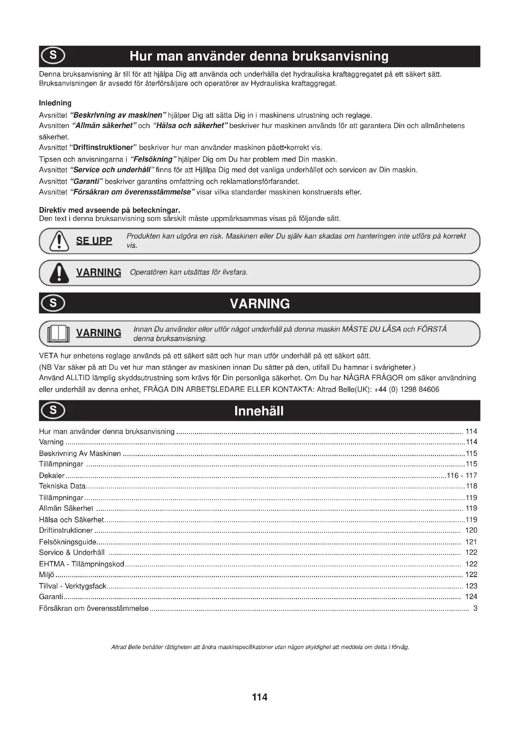 Innan Du använder eller utför något underhåll på denna maskin MÅSTE DU LÄSA och FÖRSTÅ denna bruksanvisning. VARNING Altrad Belle behåller rättigheten att ändra maskinspeci¿ kationer utan någon skyldighet att meddela om detta i förväg.115 Beskrivning Av Maskinen