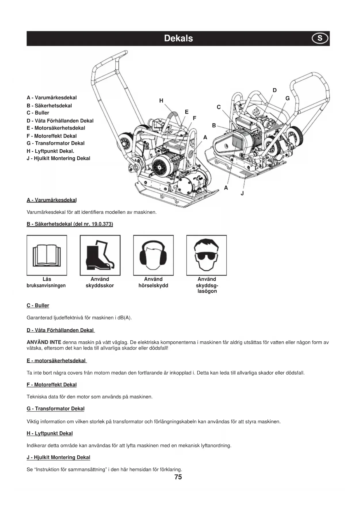 A - Varumärkesdekal Varumärkesdekal för att identi¿ era modellen av maskinen. B - Säkerhetsdekal (del nr. 19.0.373) Läs bruksanvisningen Använd skyddsskor Använd hörselskydd Använd skyddsg- lasögon C - Buller Garanterad ljudeffektnivå för maskinen i dB(A). D - Våta Förhållanden Dekal ANVÄND INTE denna maskin på vått väglag. De elektriska komponenterna i maskinen får aldrig utsättas för vatten eller någon form av vätska, eftersom det kan leda till allvarliga skador eller dödsfall! E - motorsäkerhetsdekal Ta inte bort några covers från motorn medan den fortfarande är inkopplad i. Detta kan leda till allvarliga skador eller dödsfall. F - Motoreffekt Dekal Tekniska data för den motor som används på maskinen. G - Transformator Dekal Viktig information om vilken storlek på transformator och förlängningskabeln kan användas för att styra maskinen. H - Lyftpunkt Dekal Indikerar detta område kan användas för att lyfta maskinen med en mekanisk lyftanordning. J - Hjulkit Montering Dekal Se “Instruktion för sammansättning” i den här hemsidan för förklaring. Dekals