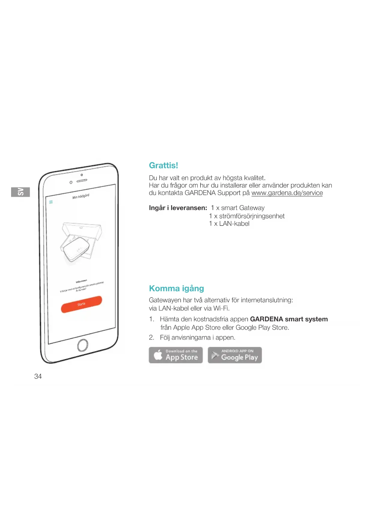 Grattis! Du har valt en produkt av högsta kvalitet. Har du frågor om hur du installerar eller använder produkten kan du kontakta GARDENA Support på www.gardena.de/service Ingår i leveransen: 1 x smart Gateway 1 x strömförsörjningsenhet 1 x LAN-kabel Komma igång Gatewayen har två alternativ för internetanslutning: via LAN-kabel eller via Wi-Fi.