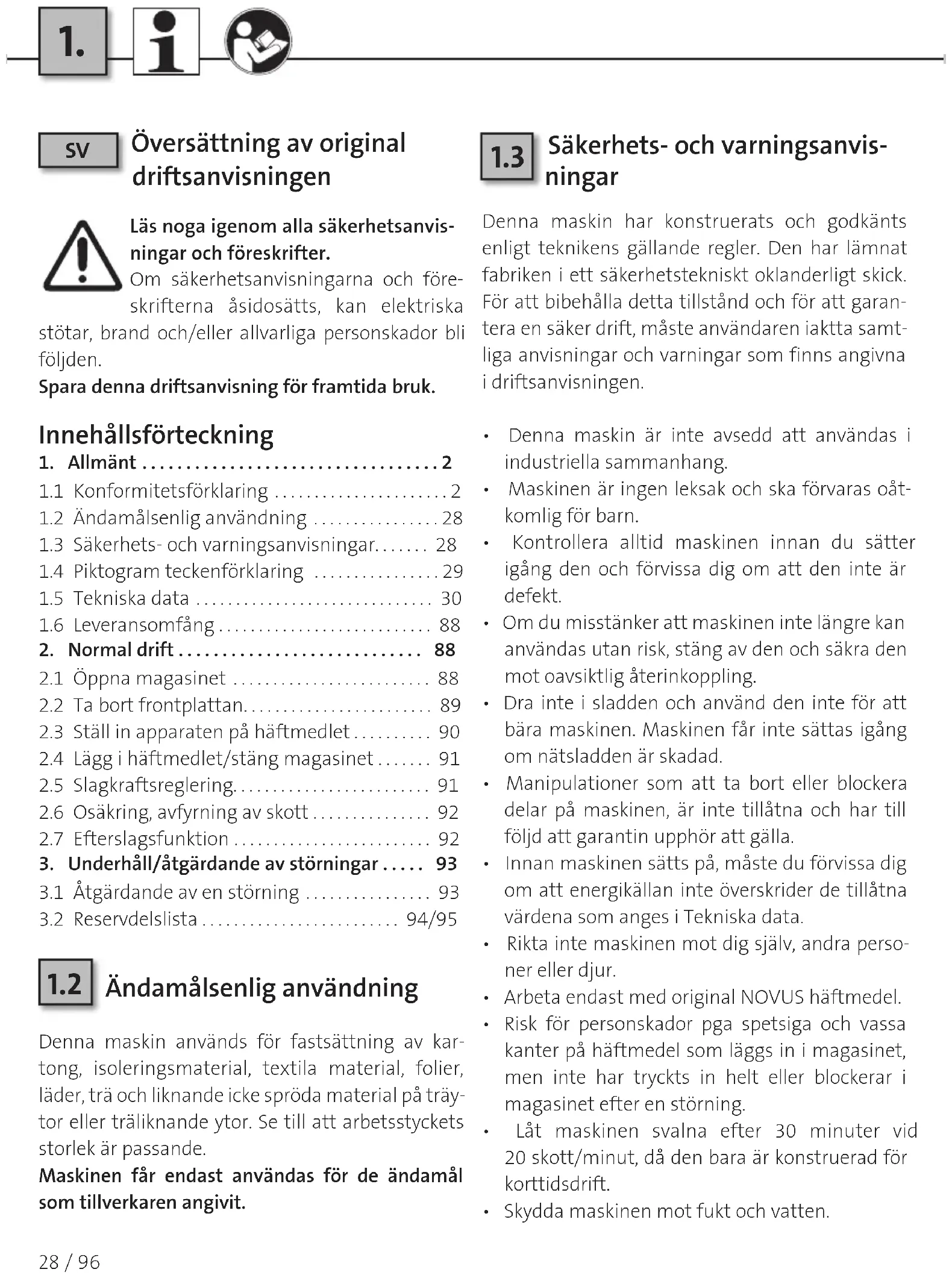 NOVUS Elektrotacker motsvarar tillämpliga säkerhets- och hälsokrav enligt EG-produktsäkerhetsdirektiv *. Apparaten stämmer överens med följande normer: ** enligt bestämmelserna i direktiven ***. Utgåva ****.3 / 96 J-165
