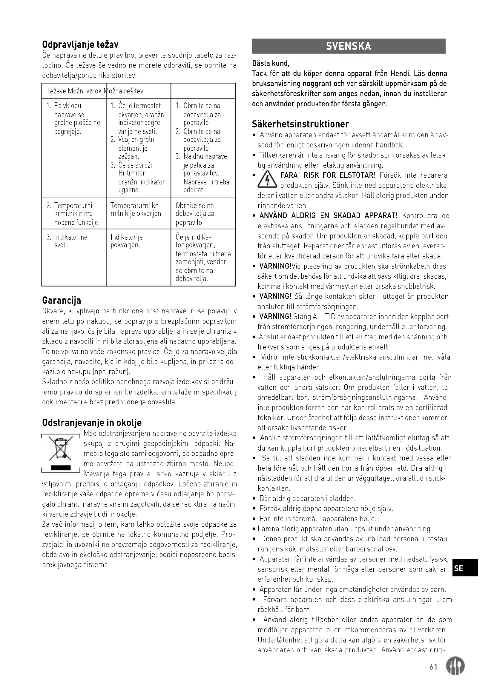 zvajalci in uvozniki ne prevzemajo odgovornosti za recikliranje, obdelavo in ekološko odstranjevanje, bodisi neposredno bodisi prek javnega sistema. SVENSKA Bästa kund, Tack för att du köper denna apparat från Hendi. Läs denna bruksanvisning noggrant och var särskilt uppmärksam på de säkerhetsföreskrifter som anges nedan, innan du installerar och använder produkten för första gången. Säkerhetsinstruktioner