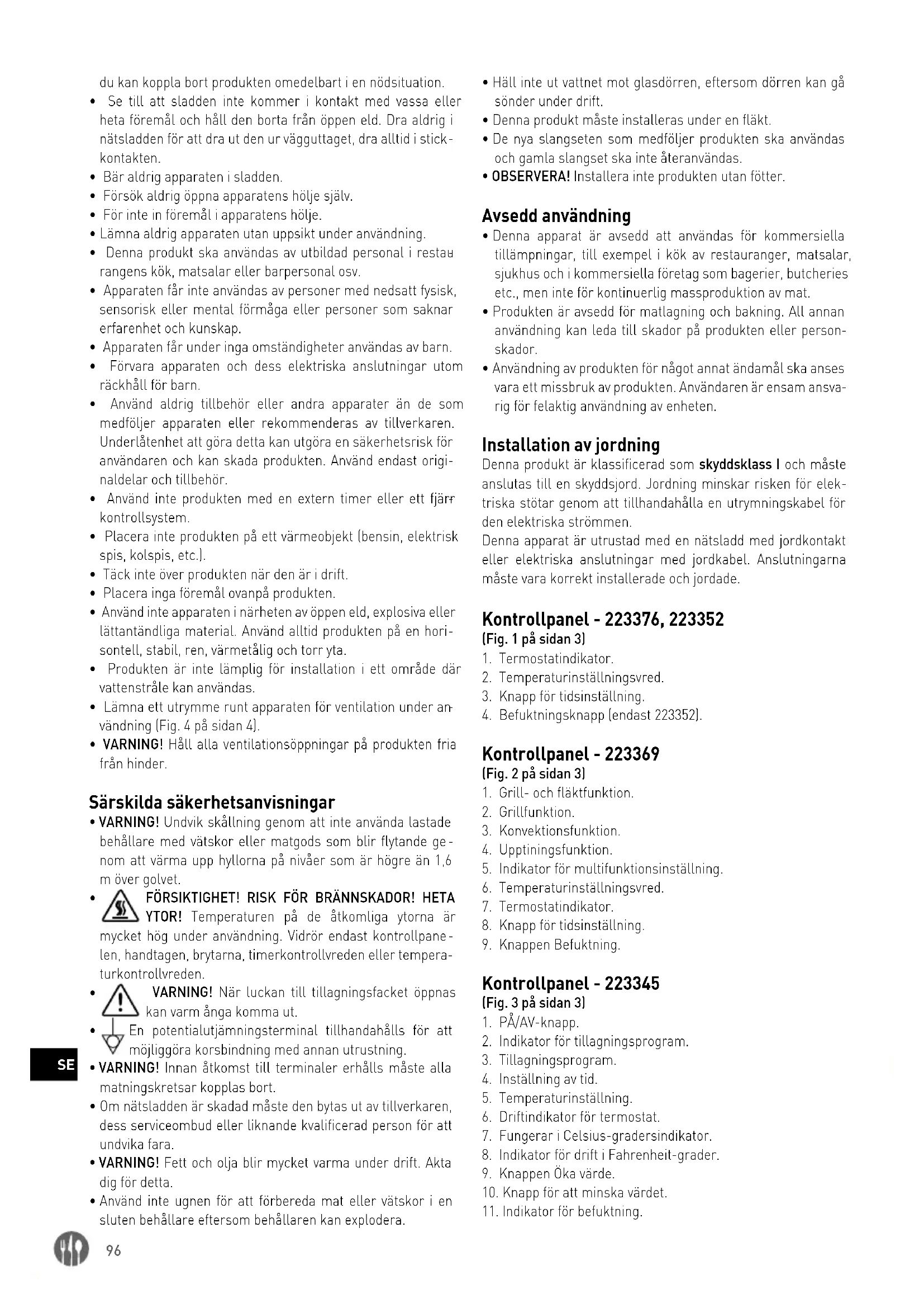 FÖRSIKTIGHET! RISK FÖR BRÄNNSKADOR! HETA YTOR! Temperaturen på de åtkomliga ytorna är mycket hög under användning. Vidrör endast kontrollpane