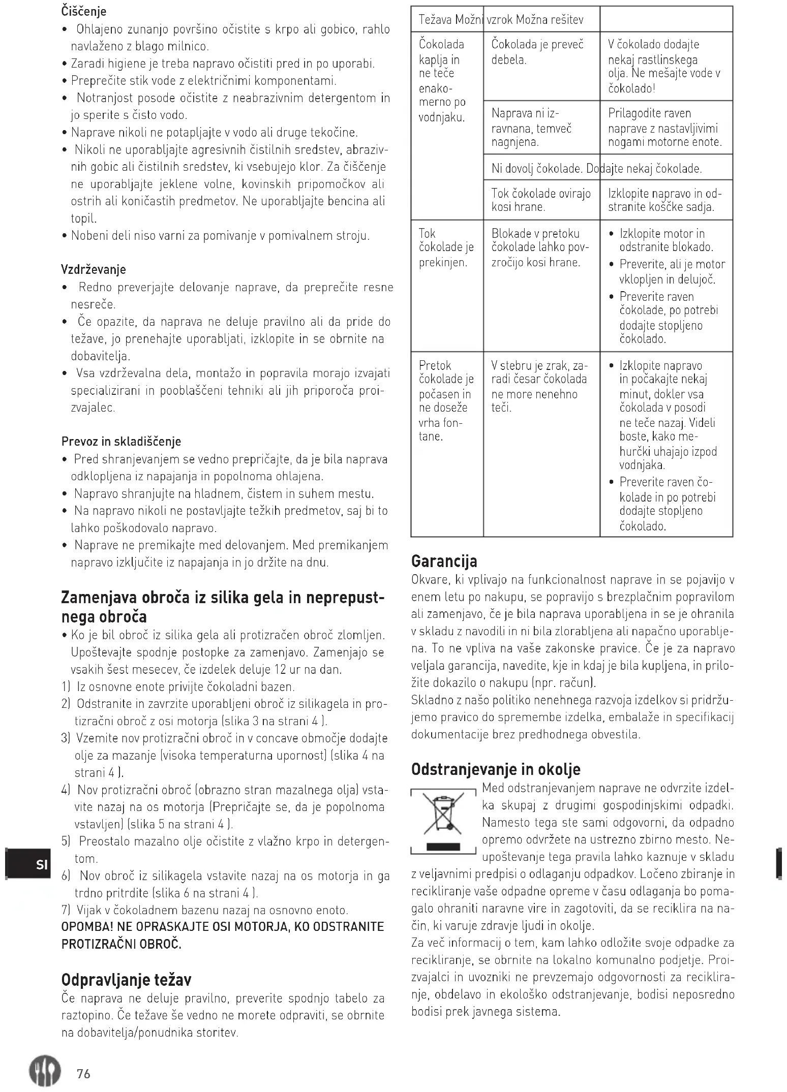 Kontrollera chokladni- vån och tillsätt smält choklad vid behov. Garanti Alla defekter som påverkar produktens funktion och som blir uppenbara inom ett år efter inköpet kommer att repareras genom kostnadsfri reparation eller utbyte, förutsatt att pro- dukten har använts och underhållits i enlighet med instruk- tionerna och inte har missbrukats eller missbrukats på något sätt. Dina lagstadgade rättigheter påverkas inte. Om produk- ten omfattas av garantin ska du ange var och när den köptes och inkludera inköpsbevis (t.ex. kvitto). I enlighet med vår policy för kontinuerlig produktutveckling förbehåller vi oss rätten att ändra specifikationerna för pro- dukt, förpackning och dokumentation utan föregående med- delande. Kassering och miljö När produkten tas ur bruk får den inte kasseras tillsammans med annat hushållsavfall. Istället är det ditt ansvar att kassera din avfallsutrust- ning genom att lämna över den till en utsedd uppsamlingsplats. Underlåtenhet att följa denna regel kan bestraffas i enlighet med gällande bestämmelser om avfallshantering. Separat insamling och återvinning av din avfallsutrustning vid tidpunkten för kassering kommer att bi- dra till att bevara naturresurser och säkerställa att den åter- vinns på ett sätt som skyddar människors hälsa och miljön. För mer information om var du kan lämna in ditt avfall för återvinning, kontakta ditt lokala återvinningsföretag. Tillver- karna och importörerna tar inte ansvar för materialåtervin- ning, behandling och ekologiskt bortskaffande, varken direkt eller genom ett offentligt system.80