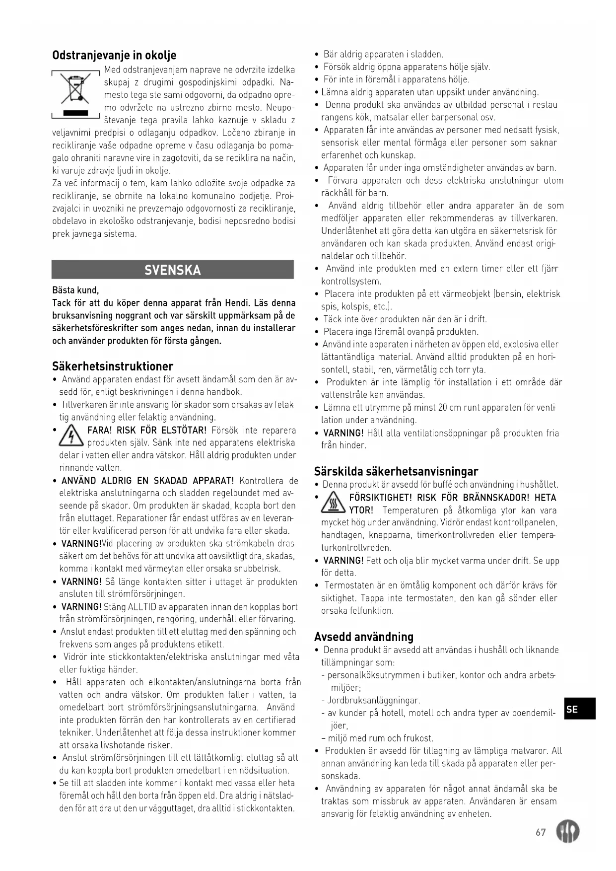 zvajalci in uvozniki ne prevzemajo odgovornosti za recikliranje, obdelavo in ekološko odstranjevanje, bodisi neposredno bodisi prek javnega sistema. SVENSKA Bästa kund, Tack för att du köper denna apparat från Hendi. Läs denna bruksanvisning noggrant och var särskilt uppmärksam på de säkerhetsföreskrifter som anges nedan, innan du installerar och använder produkten för första gången. Säkerhetsinstruktioner