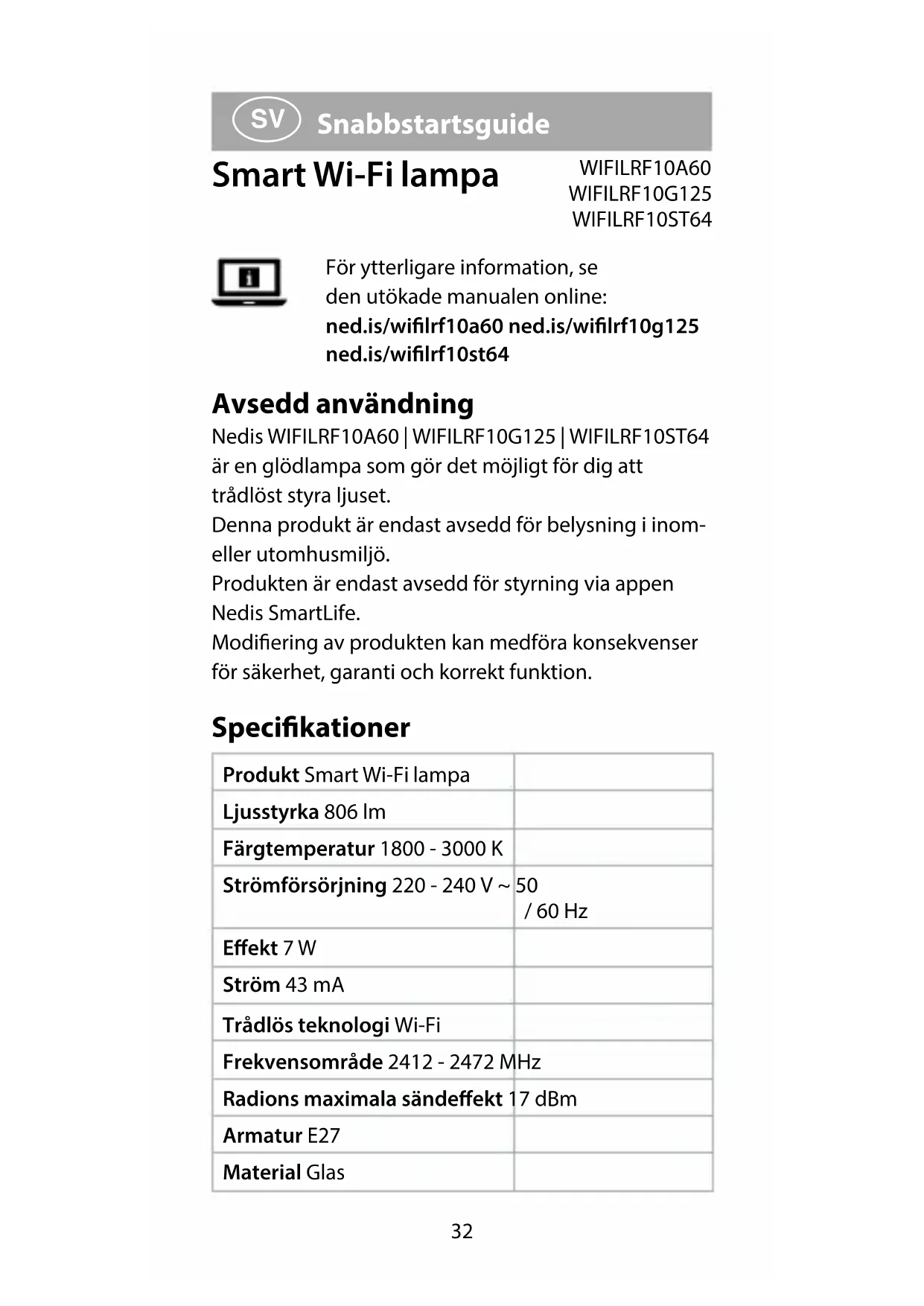Snabbstartsguide Smart Wi-Fi lampa WIFILRF10A60 WIFILRF10G125 WIFILRF10ST64 För ytterligare information, se den utökade manualen online: ned.is/wilrf10a60 ned.is/wilrf10g125 ned.is/wilrf10st64 Avsedd användning Nedis WIFILRF10A60 | WIFILRF10G125 | WIFILRF10ST64 är en glödlampa som gör det möjligt för dig att trådlöst styra ljuset. Denna produkt är endast avsedd för belysning i inom- eller utomhusmiljö. Produkten är endast avsedd för styrning via appen Nedis SmartLife. Modiering av produkten kan medföra konsekvenser för säkerhet, garanti och korrekt funktion. Specikationer Produkt Smart Wi-Fi lampa Ljusstyrka 806 lm Färgtemperatur 1800 - 3000 K Strömförsörjning 220 - 240 V ~ 50 / 60 Hz Eekt 7 W Ström 43 mA Trådlös teknologi Wi-Fi Frekvensområde 2412 - 2472 MHz Radions maximala sändeekt 17 dBm Armatur E27 Material Glas33 Artikelnummer Dimensioner Vikt WIFILRF10A60 Ø 60 x 105 mm 30 g WIFILRT10G125 Ø 125 x 172 mm 100 g WIFILRF10ST64 Ø 64 x 142 mm 46 g Huvuddelar (bild A) 1 Lampa 2 Glödtråd 3 Elektrisk kontakt Säkerhetsanvisningar