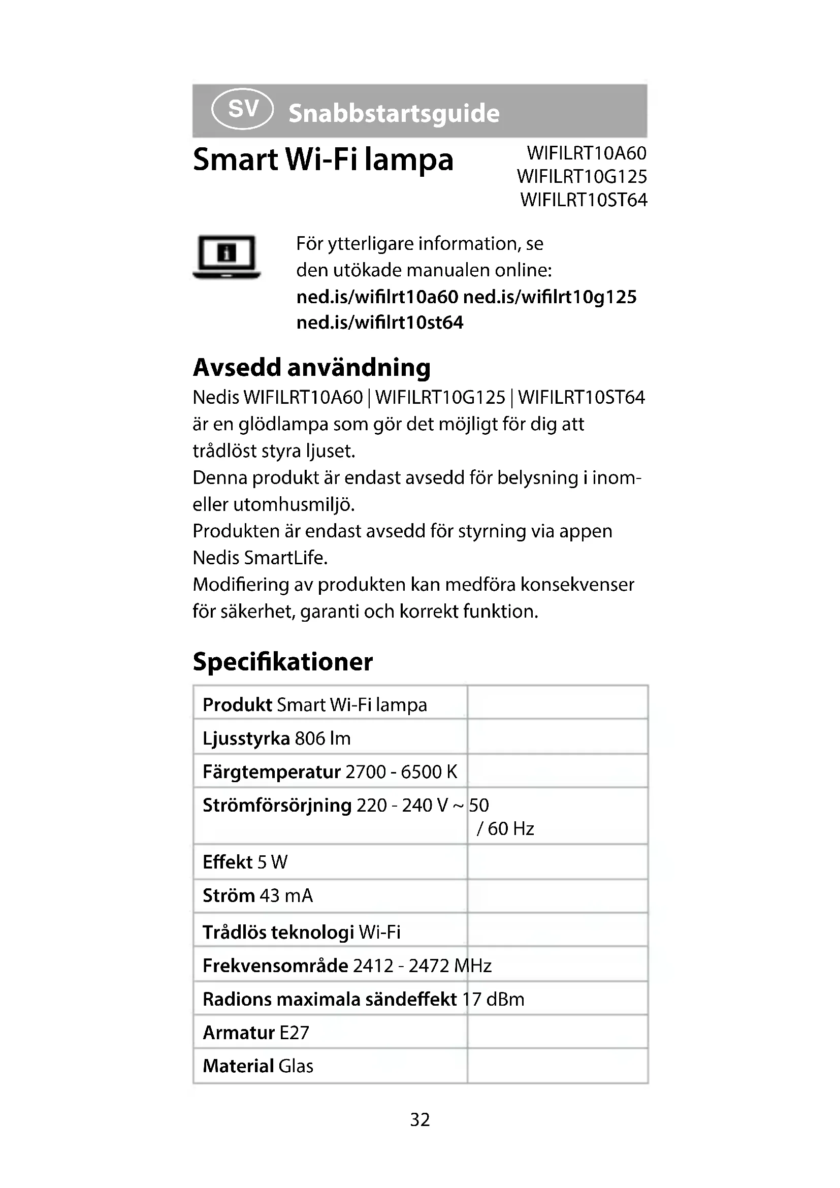 Snabbstartsguide Smart Wi-Fi lampa WIFILRT10A60 WIFILRT10G125 WIFILRT10ST64 För ytterligare information, se den utökade manualen online: ned.is/wilrt10a60 ned.is/wilrt10g125 ned.is/wilrt10st64 Avsedd användning Nedis WIFILRT10A60 | WIFILRT10G125 | WIFILRT10ST64 är en glödlampa som gör det möjligt för dig att trådlöst styra ljuset. Denna produkt är endast avsedd för belysning i inom- eller utomhusmiljö. Produkten är endast avsedd för styrning via appen Nedis SmartLife. Modiering av produkten kan medföra konsekvenser för säkerhet, garanti och korrekt funktion. Specikationer Produkt Smart Wi-Fi lampa Ljusstyrka 806 lm Färgtemperatur 2700 - 6500 K Strömförsörjning 220 - 240 V ~ 50 / 60 Hz Eekt 5 W Ström 43 mA Trådlös teknologi Wi-Fi Frekvensområde 2412 - 2472 MHz Radions maximala sändeekt 17 dBm Armatur E27 Material Glas33 Artikelnummer Dimensioner Vikt WIFILRT10A60 Ø 60 x 105 mm 30 g WIFILRT10G125 Ø 125 x 172 mm 100 g WIFILRT10ST64 Ø 64 x 142 mm 46 g Huvuddelar (bild A) 1 Lampa 2 Glödtråd 3 Elektrisk kontakt Säkerhetsanvisningar