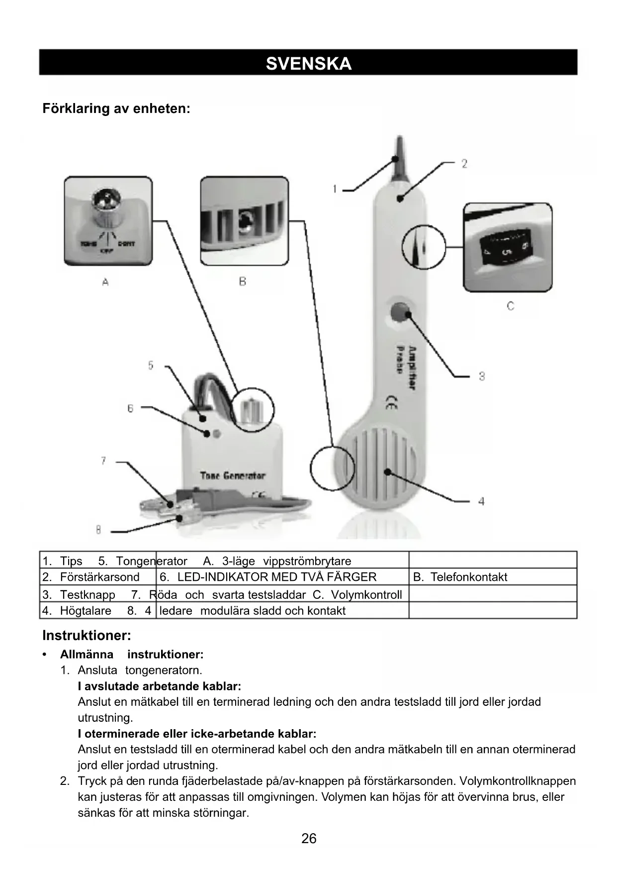 - För mer information, kontakta återförsäljaren eller lokal myndighet med ansvar för avfallshantering.29 ČESKY Tónový generátor se sondou Popis zařízení: