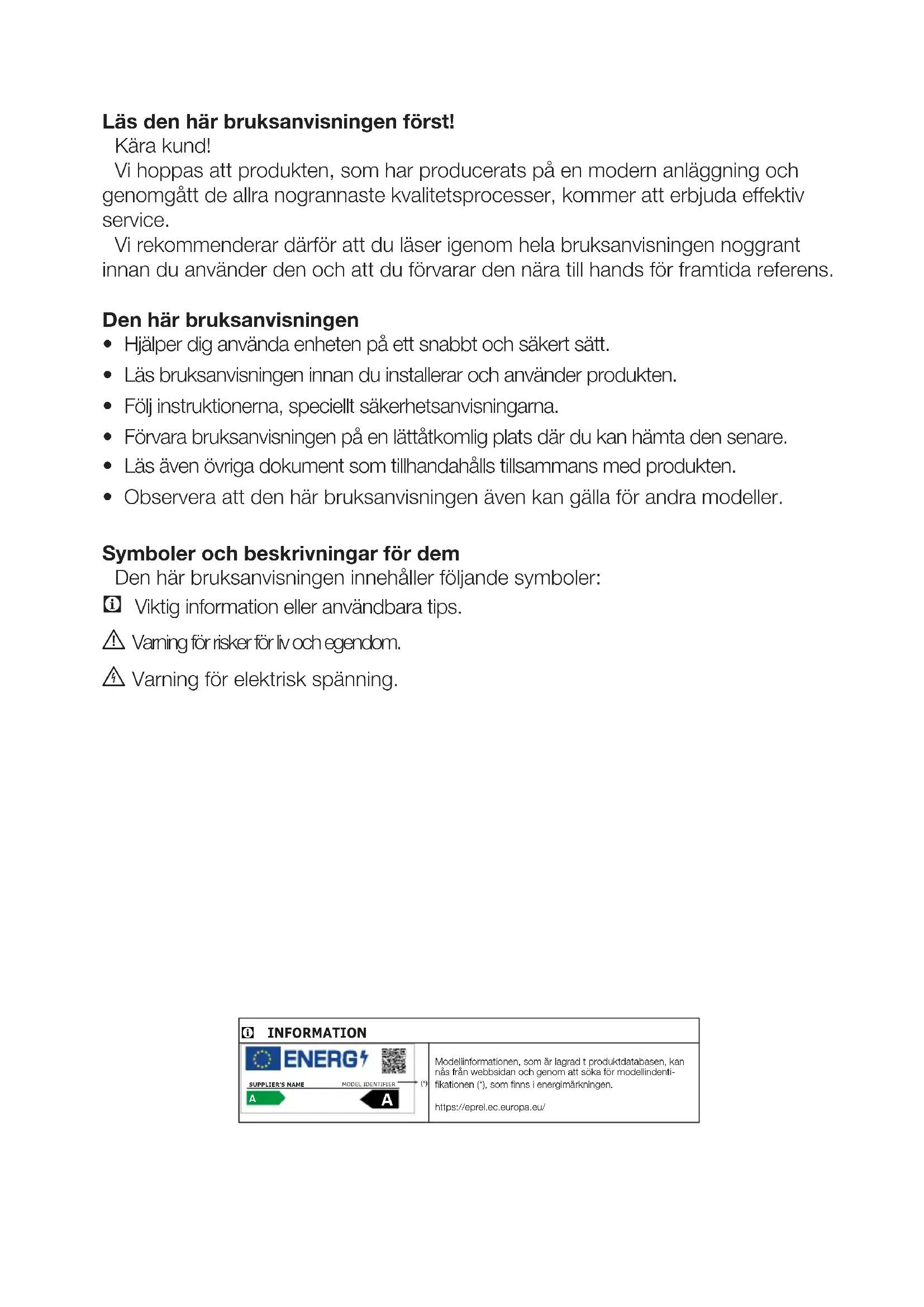 - Observera att den här bruksanvisningen även kan gälla för andra modeller. Symboler och beskrivningar för dem Den här bruksanvisningen innehåller följande symboler: C Viktig information eller användbara tips. A Varning för risker för liv och egendom. B Varning för elektrisk spänning. INFORMATION Modellinformationen, som är lagrad t produktdatabasen, kan nås från webbsidan och genom att söka för modellindenti-fikationen (*), som finns i energimärkningen.https://eprel.ec.europa.eu/