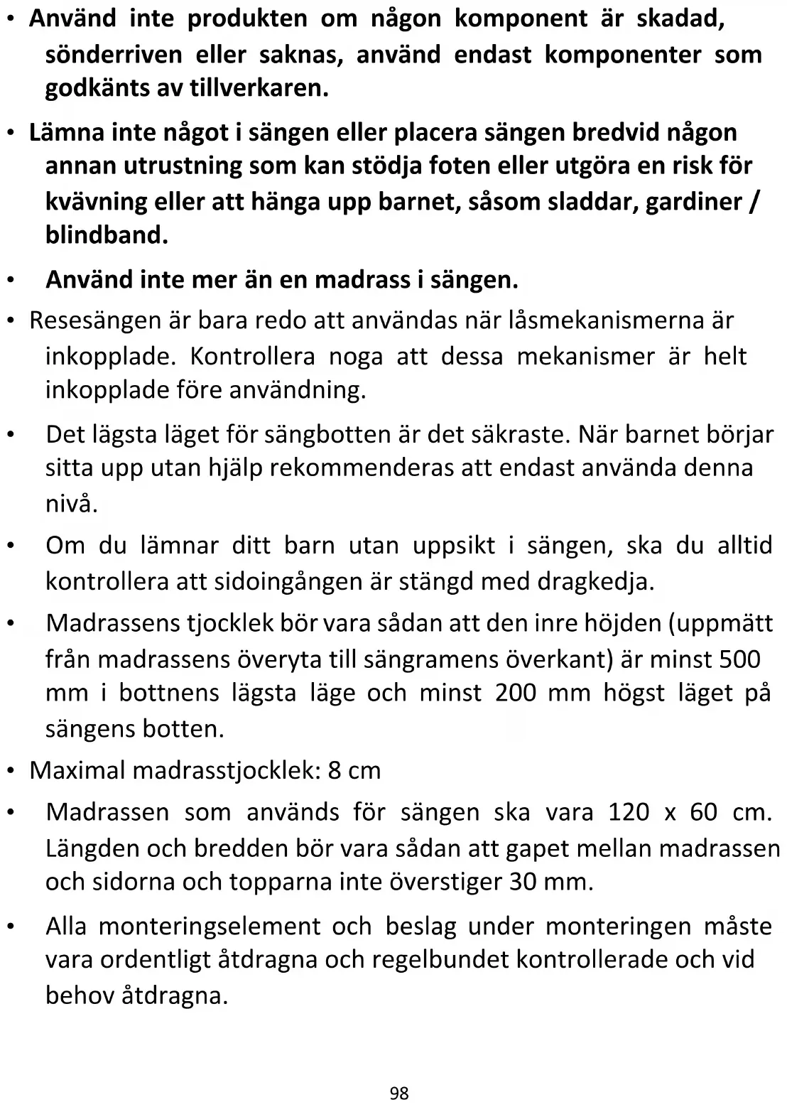 - Madrassen som används för sängen ska vara 120 x 60 cm. Längden och bredden bör vara sådan att gapet mellan madrassen och sidorna och topparna inte överstiger 30 mm.