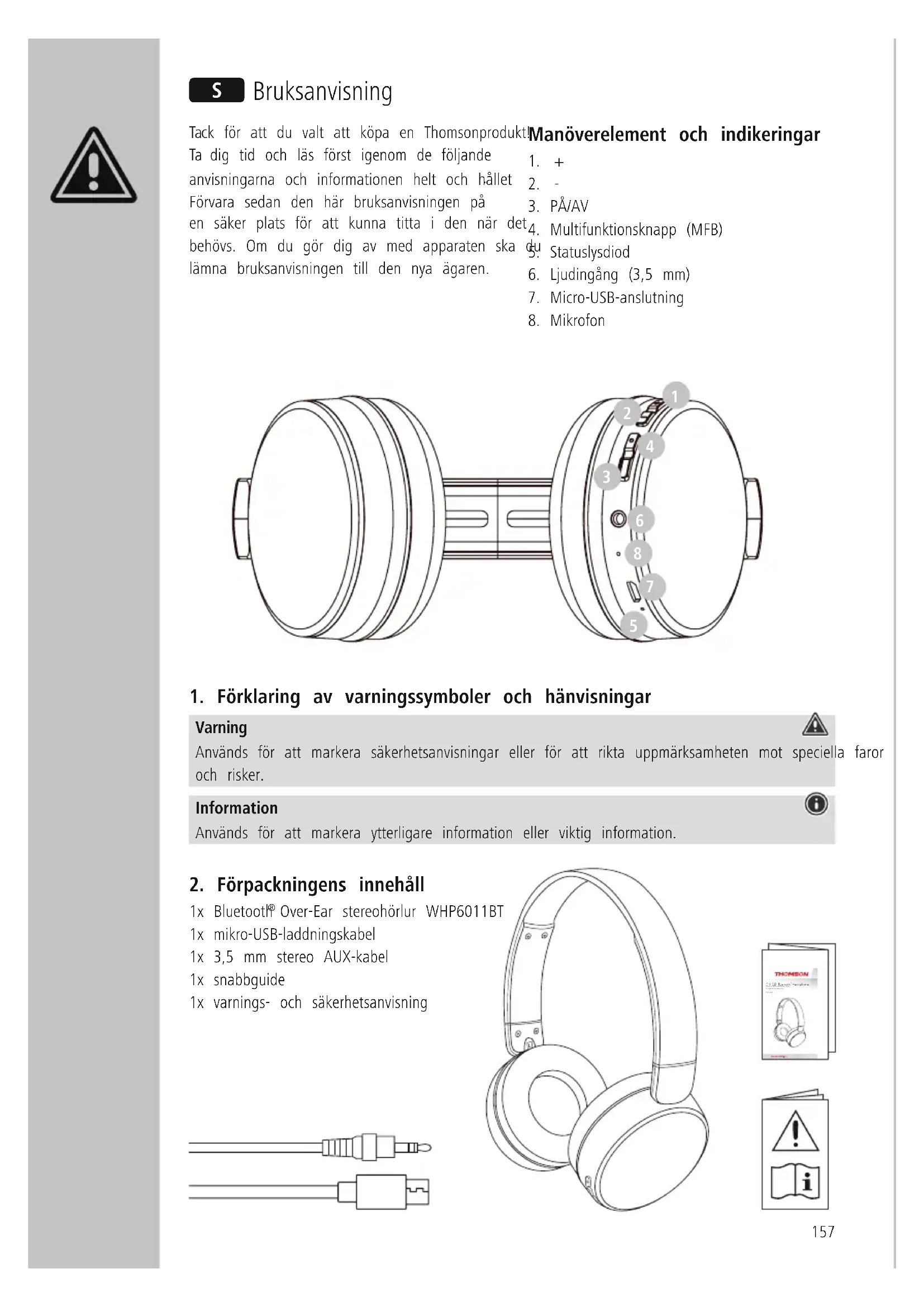 İş bu belge ile Hama GmbH & Co KG kablosuz sistem tipin [00132518] 2014/53/AB sayılı yönetmeliğe uygun olduğunu beyan eder AB Uygunluk Beyanının tam metni aşağıdaki internet adresinde incelenebilir: wwwthomson-av-accessorieseu ->00132518->İndirmeler Frekans bandı/frekans bantları 2402MHz – 2480 MHz İletilen maksimum radyo frekans gücü 2,63 dBm157 S Bruksanvisning Tack för att du valt att köpa en Thomsonprodukt! Ta dig tid och läs först igenom de följande anvisningarna och informationen helt och hållet