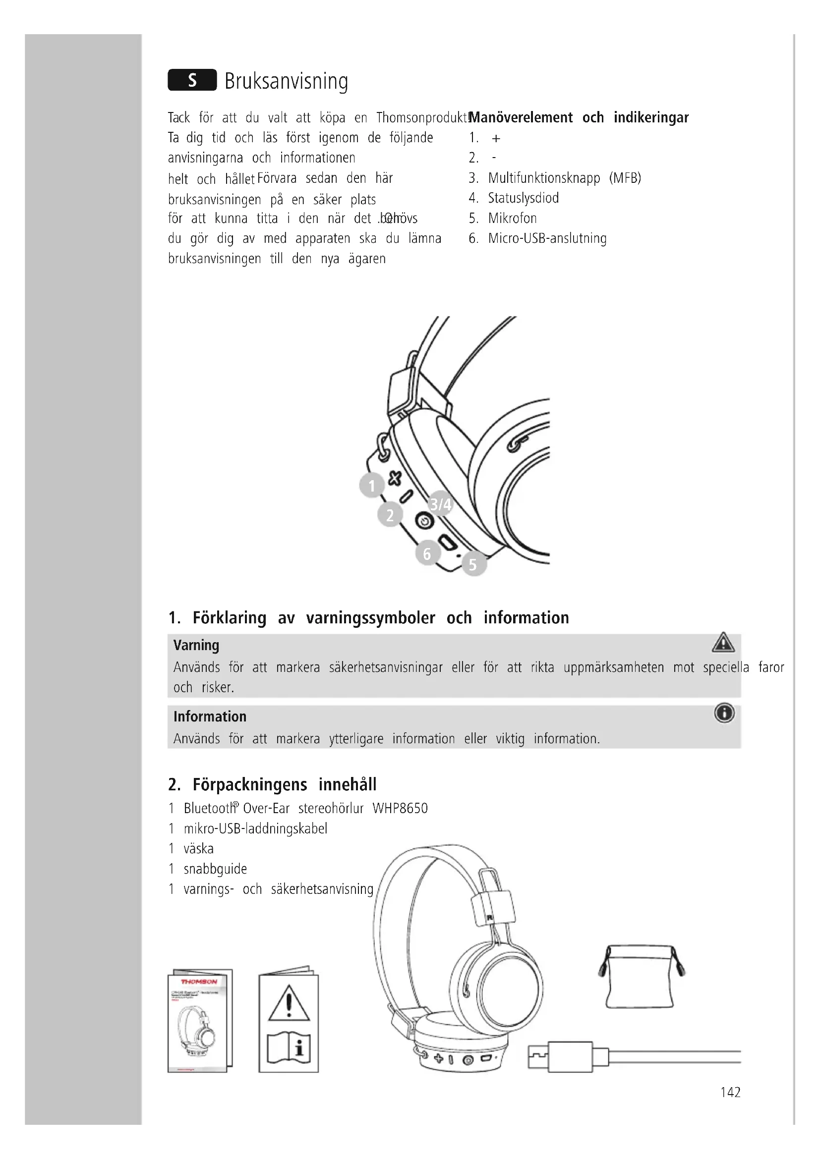 Over-Ear stereohörlur WHP8650 1 mikro-USB-laddningskabel 1 väska 1 snabbguide 1 varnings- och säkerhetsanvisning S Bruksanvisning