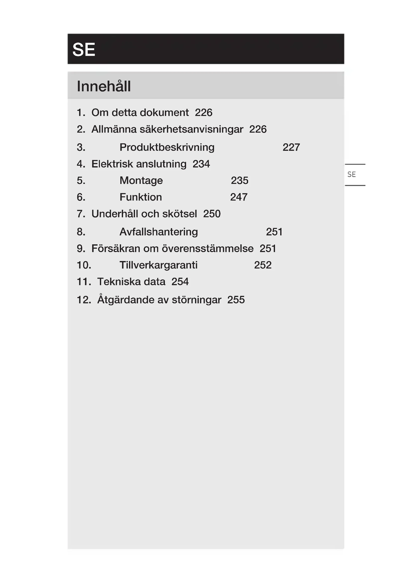 - Förvara den tillgängligt. – Hantering av elektrisk ström kan leda till farliga situa- tioner. Kontakt med strömförande delar kan medföra elektrisk chock, brännsår eller leda till döden. – Arbeten på nätspänningen får endast genomföras av kvalificerad yrkespersonal. – Installationsföreskrifter och anslutningskrav som gäller i respektive land ska iakttas (t.ex. D: VDE 0100, A: ÖVE-ÖNORM E8001-1, CH:SEV 1000).SE – 227 – Innehåll – Använd endast originalreservdelar. – Reparationer får endast genomföras av professionella företag.