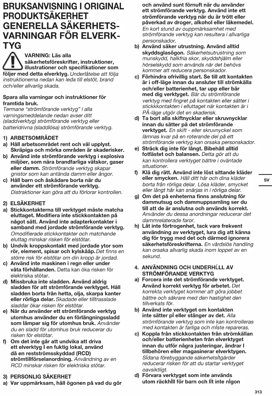 a) Forcera inte det strömförande verktyget. Använd korrekt verktyg för arbetet. Det korrekta verktyget kommer att göra jobbet bättre och säkrare med den hastighet den tillverkats för. b) Använd inte verktyget om kontakten inte sätter pĺ eller stänger av det. Alla strömförande verktyg som inte kan kontrolleras med kontakten är farliga och mĺste repareras. c) Koppla från stickkontakten från strömkällan och/eller batterienheten från elverktyget innan du utför några justeringar, ändrar I tillbehören eller magasinerar elverktygen. Sĺdana förebyggande säkerhetsĺtgärder reducerar risken för att du startar verktyget oavsiktligt. d) Förvara verktyget som inte används utom räckhĺll för barn och lĺt inte nĺgonSV
