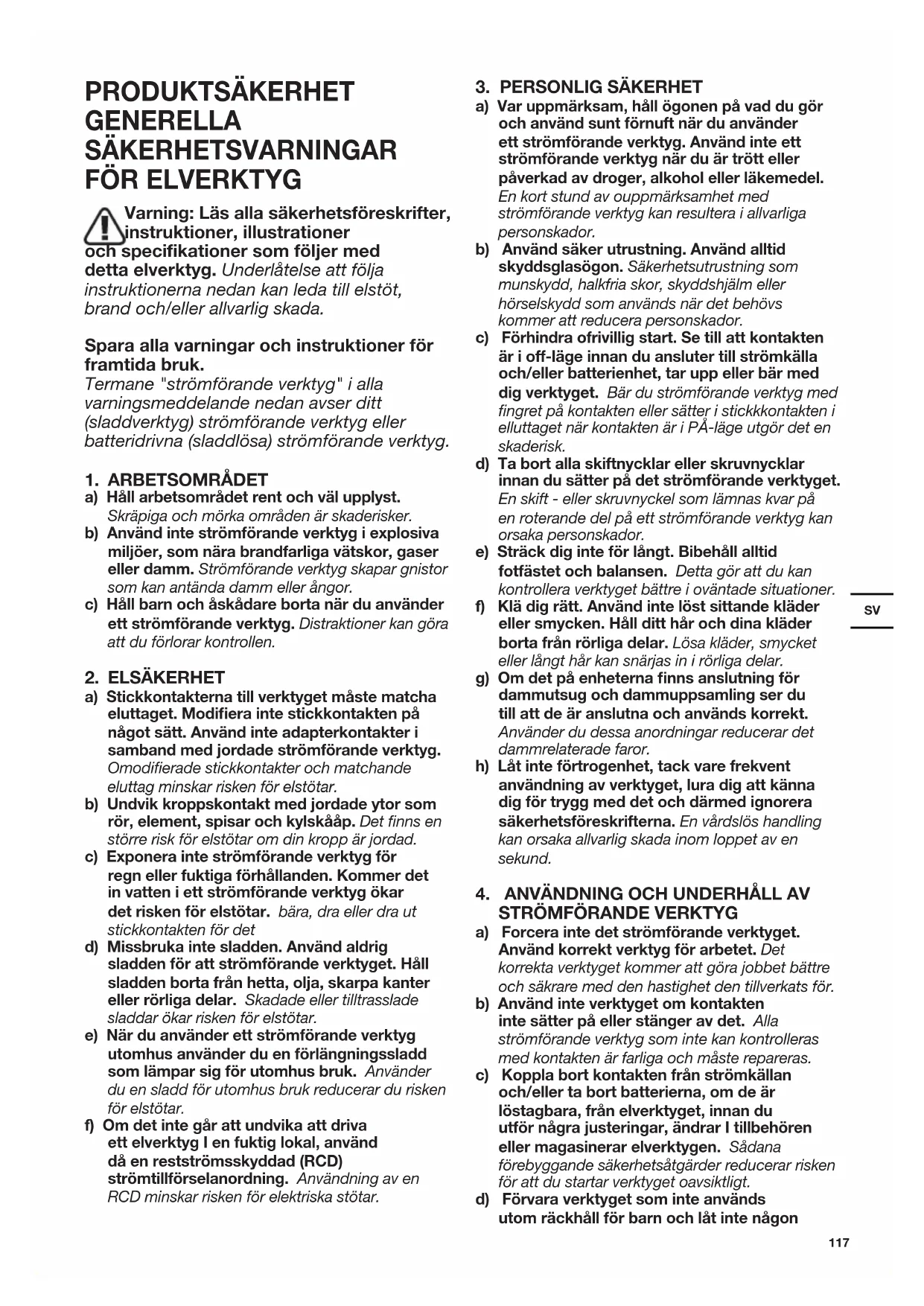 a) Forcera inte det strömförande verktyget. Använd korrekt verktyg för arbetet. Det korrekta verktyget kommer att göra jobbet bättre och säkrare med den hastighet den tillverkats för. b) Använd inte verktyget om kontakten inte sätter på eller stänger av det. Alla strömförande verktyg som inte kan kontrolleras med kontakten är farliga och måste repareras. c) Koppla bort kontakten från strömkällan och/eller ta bort batterierna, om de är löstagbara, från elverktyget, innan du utför några justeringar, ändrar I tillbehören eller magasinerar elverktygen. Sådana förebyggande säkerhetsåtgärder reducerar risken för att du startar verktyget oavsiktligt. d) Förvara verktyget som inte används utom räckhåll för barn och låt inte någon118