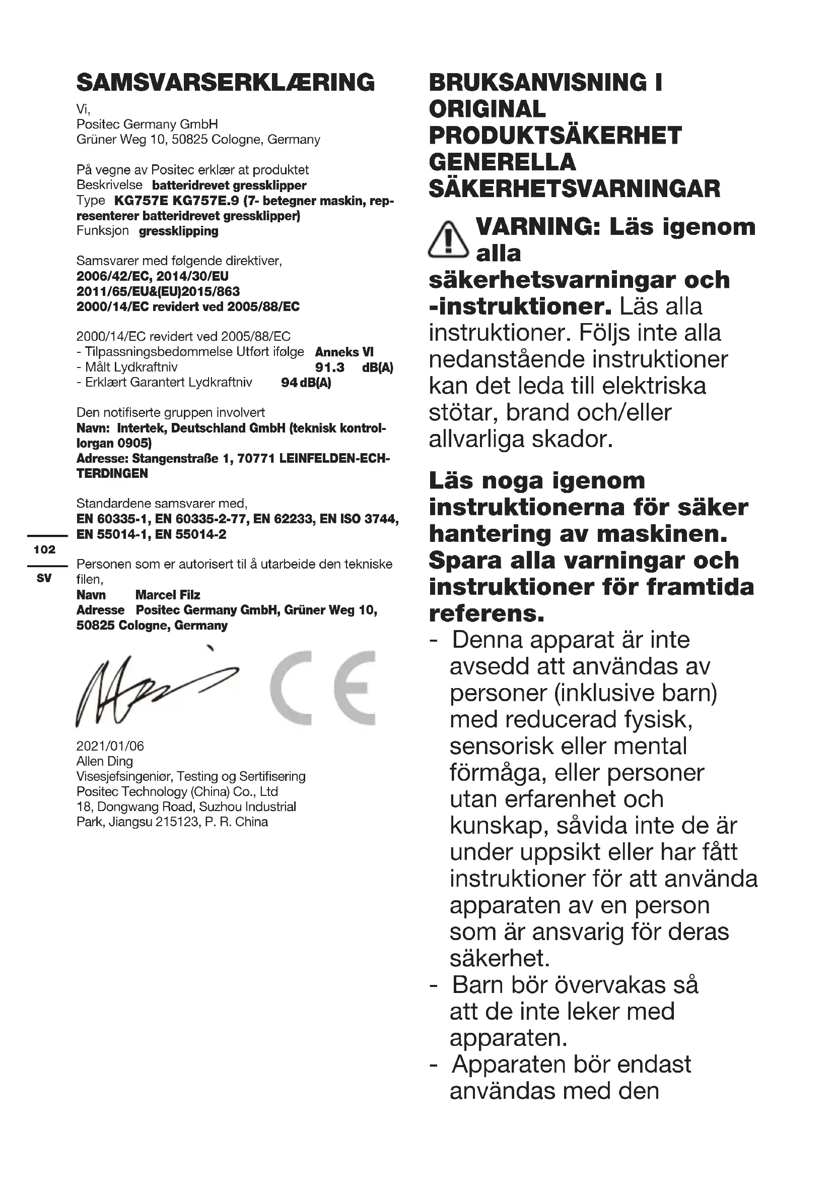 dB(A) Den notiserte gruppen involvert Navn: Intertek, Deutschland GmbH (teknisk kontrol- lorgan 0905) Adresse: Stangenstraße 1, 70771 LEINFELDEN-ECH- TERDINGEN Standardene samsvarer med, EN 60335-1, EN 60335-2-77, EN 62233, EN ISO 3744, EN 55014-1, EN 55014-2 Personen som er autorisert til å utarbeide den tekniske len, Navn Marcel Filz Adresse Positec Germany GmbH, Grüner Weg 10, 50825 Cologne, Germany 2021/01/06 Allen Ding Visesjefsingeniør, Testing og Sertisering Positec Technology (China) Co., Ltd 18, Dongwang Road, Suzhou Industrial Park, Jiangsu 215123, P. R. China BRUKSANVISNING I ORIGINAL PRODUKTSÄKERHET GENERELLA SÄKERHETSVARNINGAR VARNING: Läs igenom alla säkerhetsvarningar och -instruktioner. Läs alla instruktioner. Följs inte alla nedanstående instruktioner kan det leda till elektriska stötar, brand och/eller allvarliga skador. Läs noga igenom instruktionerna för säker hantering av maskinen. Spara alla varningar och instruktioner för framtida referens. - Denna apparat är inte avsedd att användas av personer (inklusive barn) med reducerad fysisk, sensorisk eller mental förmåga, eller personer utan erfarenhet och kunskap, såvida inte de är under uppsikt eller har fått instruktioner för att använda apparaten av en person som är ansvarig för deras säkerhet. - Barn bör övervakas så att de inte leker med apparaten. - Apparaten bör endast användas med den103