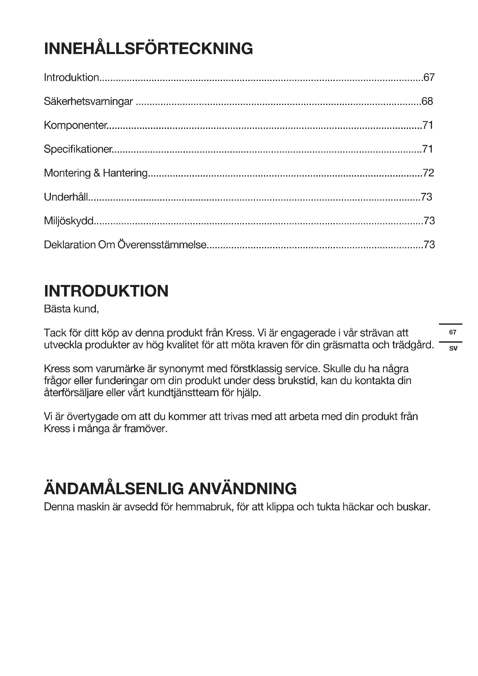 - Deklaration Om Överensstämmelse INTRODUKTION Bästa kund, Tack för ditt köp av denna produkt från Kress. Vi är engagerade i vår strävan att utveckla produkter av hög kvalitet för att möta kraven för din gräsmatta och trädgård. Kress som varumärke är synonymt med förstklassig service. Skulle du ha några frågor eller funderingar om din produkt under dess brukstid, kan du kontakta din återförsäljare eller vårt kundtjänstteam för hjälp. Vi är övertygade om att du kommer att trivas med att arbeta med din produkt från Kress i många år framöver. p. 73