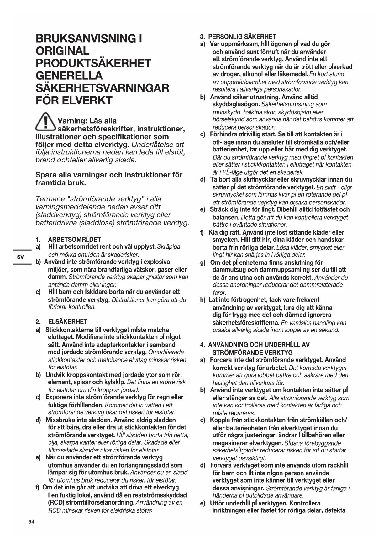 a) Stickkontakterna till verktyget mĺste matcha eluttaget. Modifiera inte stickkontakten pĺ nĺgot sätt. Använd inte adapterkontakter i samband med jordade strömförande verktyg. Omodierade stickkontakter och matchande eluttag minskar risken för elstötar. b) Undvik kroppskontakt med jordade ytor som rör, element, spisar och kylskĺp. Det nns en större risk för elstötar om din kropp är jordad. c) Exponera inte strömförande verktyg för regn eller fuktiga förhĺllanden. Kommer det in vatten i ett strömförande verktyg ökar det risken för elstötar. d) Missbruka inte sladden. Använd aldrig sladden för att bära, dra eller dra ut stickkontakten för det strömförande verktyget. Hĺll sladden borta frĺn hetta, olja, skarpa kanter eller rörliga delar. Skadade eller tilltrasslade sladdar ökar risken för elstötar. e) När du använder ett strömförande verktyg utomhus använder du en förlängningssladd som lämpar sig för utomhus bruk. Använder du en sladd för utomhus bruk reducerar du risken för elstötar. f) Om det inte går att undvika att driva ett elverktyg I en fuktig lokal, använd då en restströmsskyddad (RCD) strömtillförselanordning. Användning av en RCD minskar risken för elektriska stötar