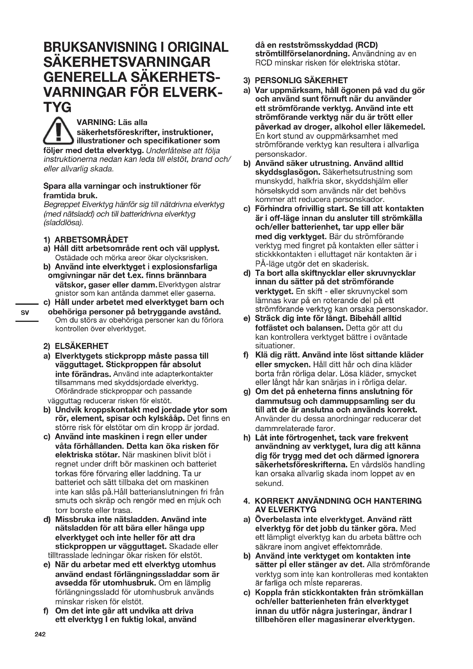 a) Elverktygets stickpropp måste passa till vägguttaget. Stickproppen får absolut inte förändras. Använd inte adapterkontakter tillsammans med skyddsjordade elverktyg. Oförändrade stickproppar och passande vägguttag reducerar risken för elstöt. b) Undvik kroppskontakt med jordade ytor som rör, element, spisar och kylskååp. Det nns en större risk för elstötar om din kropp är jordad. c) Använd inte maskinen i regn eller under våta förhållanden. Detta kan öka risken för elektriska stötar. När maskinen blivit blöt i regnet under drift bör maskinen och batteriet torkas före förvaring eller laddning. Ta ur batteriet och sätt tillbaka det om maskinen inte kan slås på.Håll batterianslutningen fri från smuts och skräp och rengör med en mjuk och torr borste eller trasa. d) Missbruka inte nätsladden. Använd inte nätsladden för att bära eller hänga upp elverktyget och inte heller för att dra stickproppen ur vägguttaget. Skadade eller tilltrasslade ledningar ökar risken för elstöt. e) När du arbetar med ett elverktyg utomhus använd endast förlängningssladdar som är avsedda för utomhusbruk. Om en lämplig förlängningssladd för utomhusbruk används minskar risken för elstöt. f) Om det inte går att undvika att driva ett elverktyg I en fuktig lokal, använd då en restströmsskyddad (RCD) strömtillförselanordning. Användning av en RCD minskar risken för elektriska stötar.