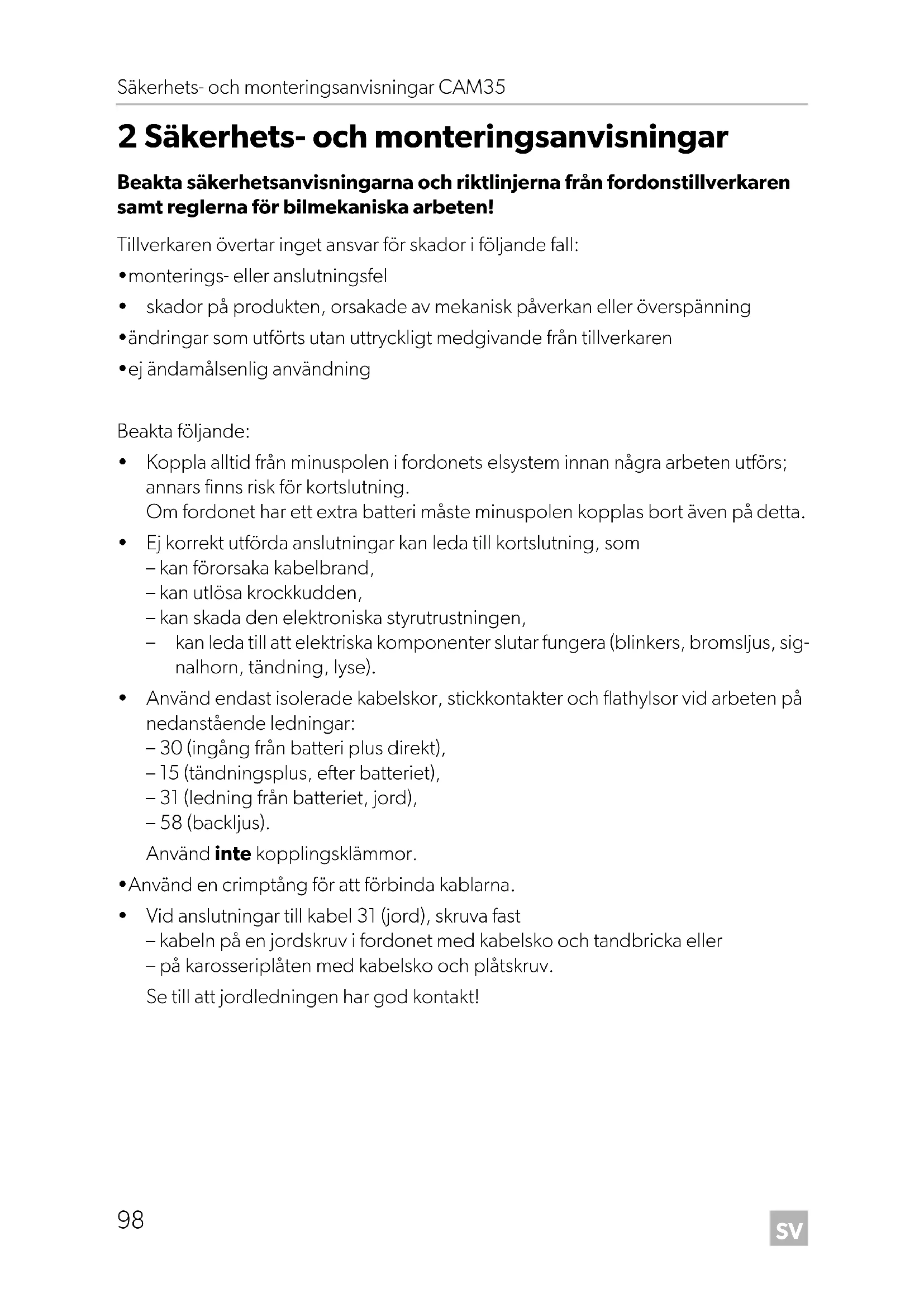 - Vid anslutningar till kabel 31 (jord), skruva fast – kabeln på en jordskruv i fordonet med kabelsko och tandbricka eller – på karosseriplåten med kabelsko och plåtskruv. Se till att jordledningen har god kontakt! CAM35-IO-16s.book Seite 98 Dienstag, 21. Februar 2017 5:31 17SV CAM35 Säkerhets- och monteringsanvisningar