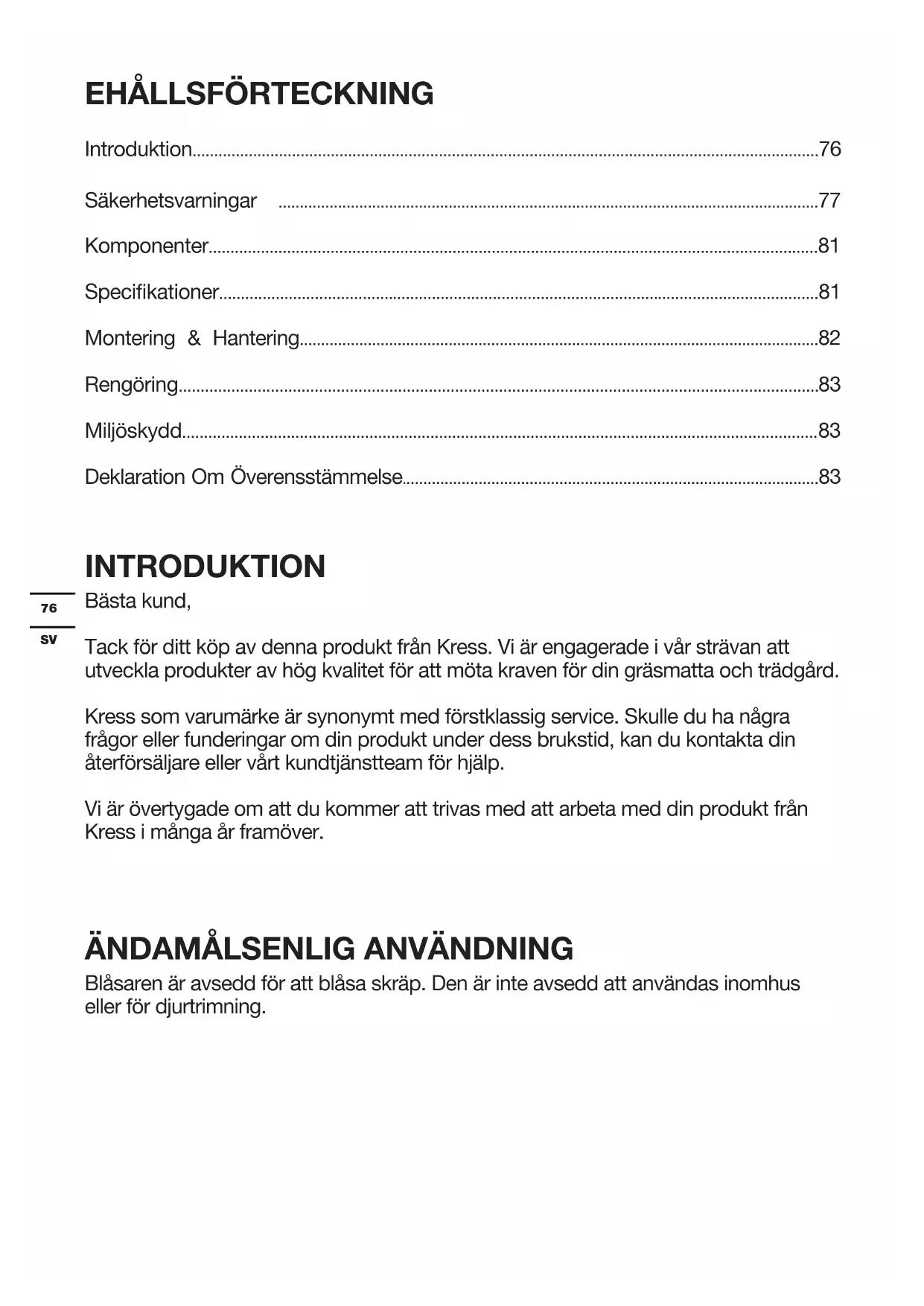 - Deklaration Om Överensstämmelse INTRODUKTION Bästa kund, Tack för ditt köp av denna produkt från Kress. Vi är engagerade i vår strävan att utveckla produkter av hög kvalitet för att möta kraven för din gräsmatta och trädgård. Kress som varumärke är synonymt med förstklassig service. Skulle du ha några frågor eller funderingar om din produkt under dess brukstid, kan du kontakta din återförsäljare eller vårt kundtjänstteam för hjälp. Vi är övertygade om att du kommer att trivas med att arbeta med din produkt från Kress i många år framöver. p. 83