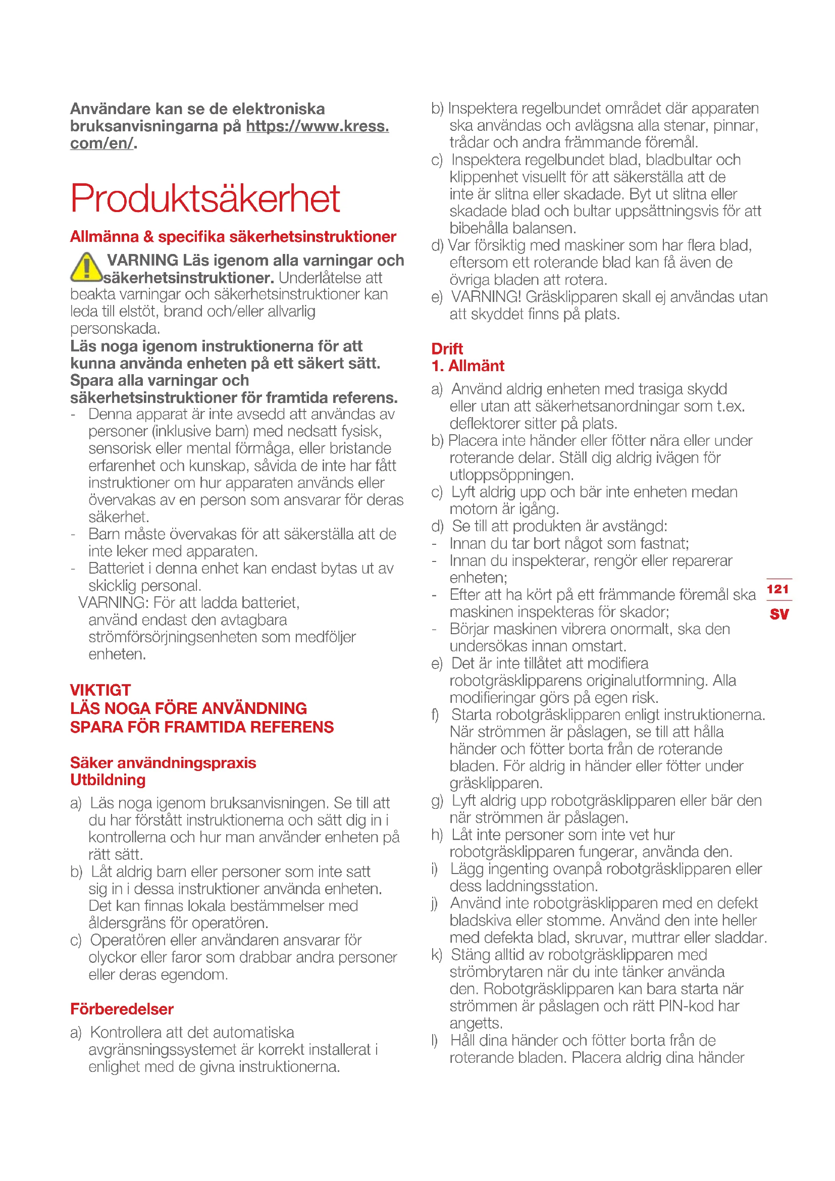 Användare kan se de elektroniska bruksanvisningarna på https://www.kress. com/en/. Produktsäkerhet Allmänna & specifika säkerhetsinstruktioner VARNING Läs igenom alla varningar och säkerhetsinstruktioner. Underlåtelse att beakta varningar och säkerhetsinstruktioner kan leda till elstöt, brand och/eller allvarlig personskada. Läs noga igenom instruktionerna för att kunna använda enheten på ett säkert sätt. Spara alla varningar och säkerhetsinstruktioner för framtida referens. - Denna apparat är inte avsedd att användas av personer (inklusive barn) med nedsatt fysisk, sensorisk eller mental förmåga, eller bristande erfarenhet och kunskap, såvida de inte har fått instruktioner om hur apparaten används eller övervakas av en person som ansvarar för deras säkerhet. - Barn måste övervakas för att säkerställa att de inte leker med apparaten. - Batteriet i denna enhet kan endast bytas ut av skicklig personal. VARNING: För att ladda batteriet, använd endast den avtagbara strömförsörjningsenheten som medföljer enheten. VIKTIGT LÄS NOGA FÖRE ANVÄNDNING
