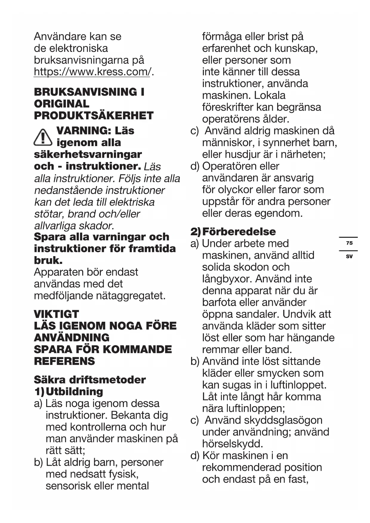 Användare kan se de elektroniska bruksanvisningarna på https://www.kress.com/. BRUKSANVISNING I ORIGINAL PRODUKTSÄKERHET VARNING: Läs igenom alla säkerhetsvarningar och - instruktioner. Läs alla instruktioner. Följs inte alla nedanstående instruktioner kan det leda till elektriska stötar, brand och/eller allvarliga skador. Spara alla varningar och instruktioner för framtida bruk. Apparaten bör endast användas med det medföljande nätaggregatet. VIKTIGT