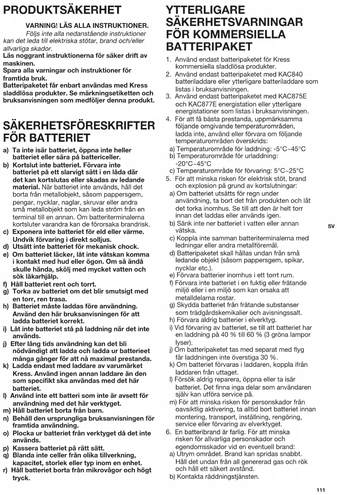 PRODUKTSÄKERHET VARNING! LÄS ALLA INSTRUKTIONER. Följs inte alla nedanstående instruktioner kan det leda till elektriska stötar, brand och/eller allvarliga skador. Läs noggrant instruktionerna för säker drift av maskinen. Spara alla varningar och instruktioner för framtida bruk. Batteripaketet får enbart användas med Kress sladdlösa produkter. Se märkningsetiketten och bruksanvisningen som medföljer denna produkt.