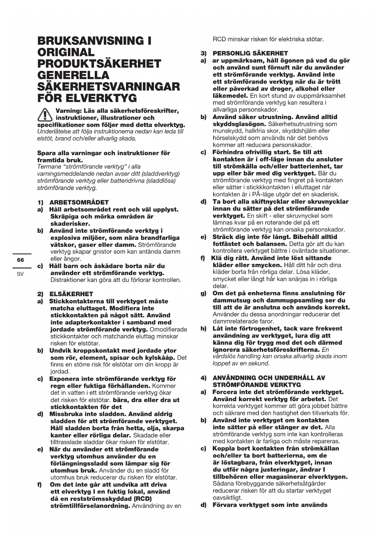 Varning: Läs alla säkerhetsföreskrifter, instruktioner, illustrationer och specifikationer som följer med detta elverktyg. Underlåtelse att följa instruktionerna nedan kan leda till elstöt, brand och/eller allvarlig skada. Spara alla varningar och instruktioner för framtida bruk. Termane “strömförande verktyg” i alla varningsmeddelande nedan avser ditt (sladdverktyg) strömförande verktyg eller batteridrivna (sladdlösa) strömförande verktyg.