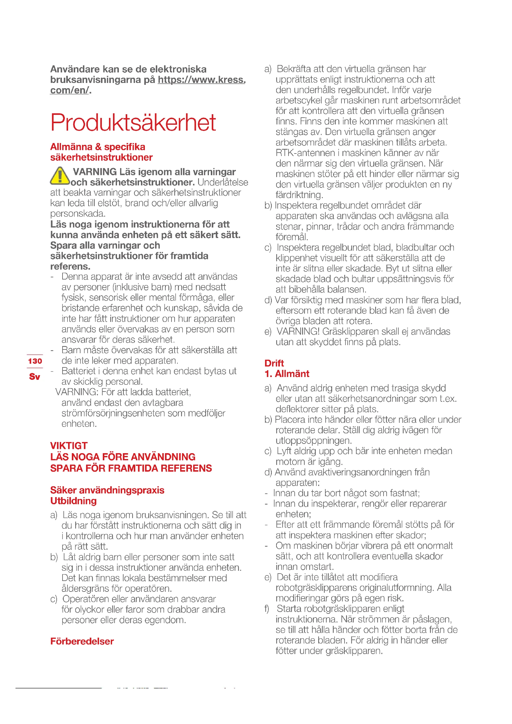 Användare kan se de elektroniska bruksanvisningarna på https://www.kress. com/en/. Produktsäkerhet Allmänna & specifika säkerhetsinstruktioner VARNING Läs igenom alla varningar och säkerhetsinstruktioner. Underlåtelse att beakta varningar och säkerhetsinstruktioner kan leda till elstöt, brand och/eller allvarlig personskada. Läs noga igenom instruktionerna för att kunna använda enheten på ett säkert sätt. Spara alla varningar och säkerhetsinstruktioner för framtida referens. - Denna apparat är inte avsedd att användas av personer (inklusive barn) med nedsatt fysisk, sensorisk eller mental förmåga, eller bristande erfarenhet och kunskap, såvida de inte har fått instruktioner om hur apparaten används eller övervakas av en person som ansvarar för deras säkerhet. - Barn måste övervakas för att säkerställa att de inte leker med apparaten. - Batteriet i denna enhet kan endast bytas ut av skicklig personal. VARNING: För att ladda batteriet, använd endast den avtagbara strömförsörjningsenheten som medföljer enheten. VIKTIGT LÄS NOGA FÖRE ANVÄNDNING