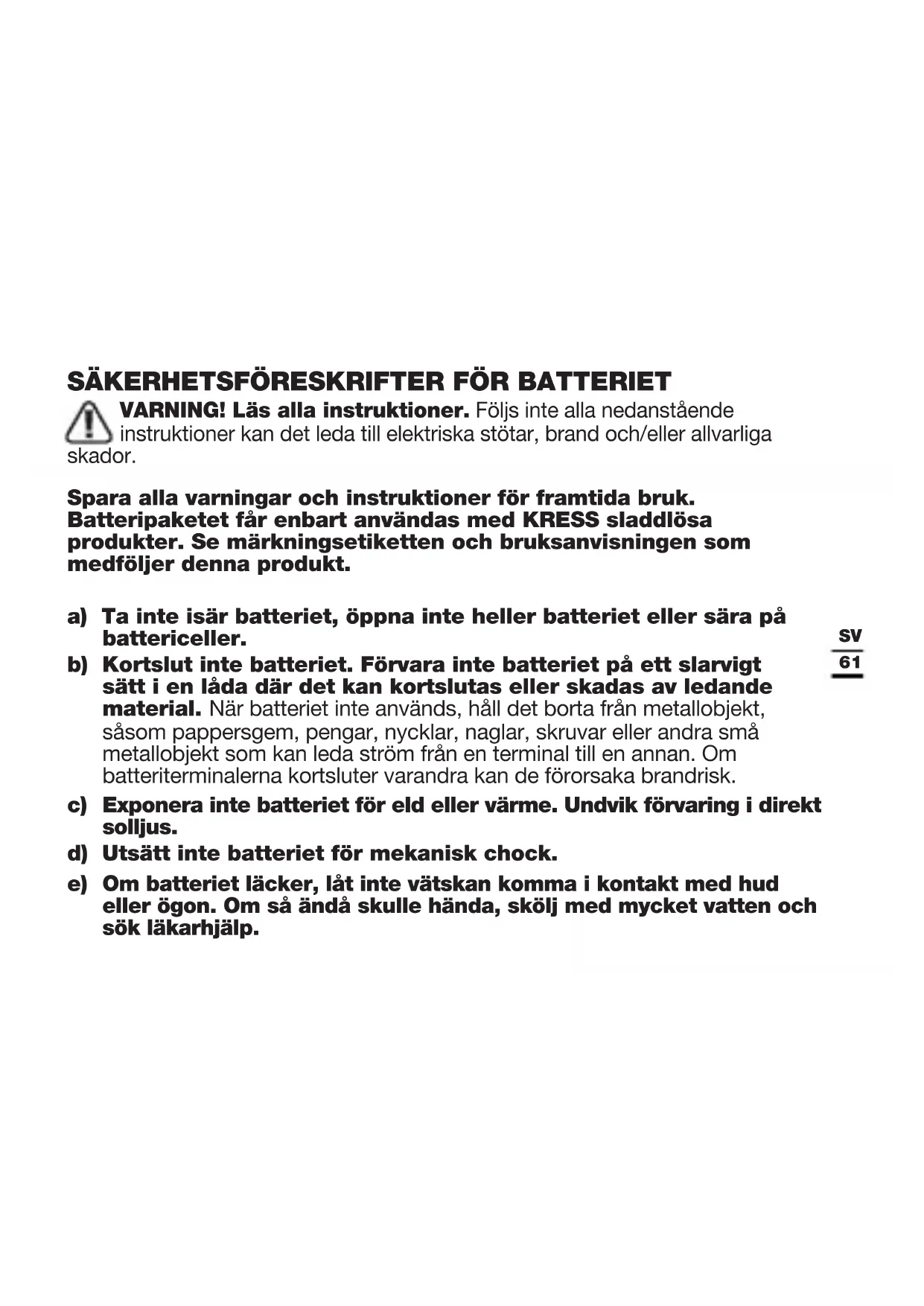 VARNING! Läs alla instruktioner. Följs inte alla nedanstående instruktioner kan det leda till elektriska stötar, brand och/eller allvarliga skador. Spara alla varningar och instruktioner för framtida bruk. Batteripaketet får enbart användas med KRESS sladdlösa produkter. Se märkningsetiketten och bruksanvisningen som medföljer denna produkt. a) Ta inte isär batteriet, öppna inte heller batteriet eller sära på battericeller. b) Kortslut inte batteriet. Förvara inte batteriet på ett slarvigt sätt i en låda där det kan kortslutas eller skadas av ledande material. När batteriet inte används, håll det borta från metallobjekt, såsom pappersgem, pengar, nycklar, naglar, skruvar eller andra små metallobjekt som kan leda ström från en terminal till en annan. Om batteriterminalerna kortsluter varandra kan de förorsaka brandrisk.