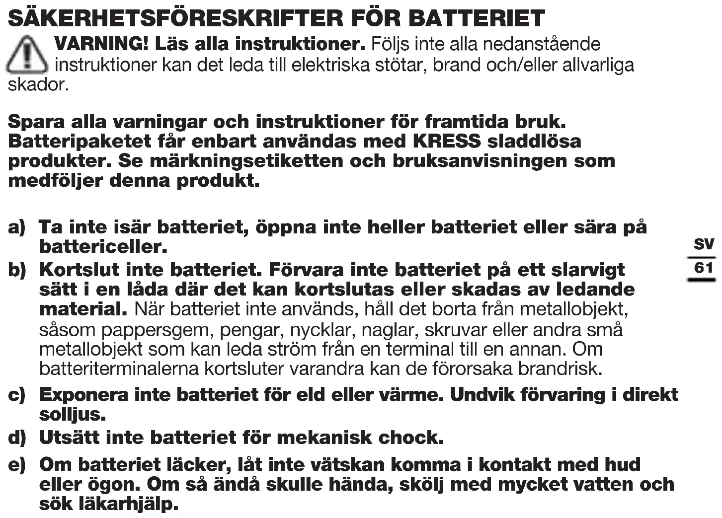 VARNING! Läs alla instruktioner. Följs inte alla nedanstående instruktioner kan det leda till elektriska stötar, brand och/eller allvarliga skador. Spara alla varningar och instruktioner för framtida bruk. Batteripaketet får enbart användas med KRESS sladdlösa produkter. Se märkningsetiketten och bruksanvisningen som medföljer denna produkt. a) Ta inte isär batteriet, öppna inte heller batteriet eller sära på battericeller. b) Kortslut inte batteriet. Förvara inte batteriet på ett slarvigt sätt i en låda där det kan kortslutas eller skadas av ledande material. När batteriet inte används, håll det borta från metallobjekt, såsom pappersgem, pengar, nycklar, naglar, skruvar eller andra små metallobjekt som kan leda ström från en terminal till en annan. Om batteriterminalerna kortsluter varandra kan de förorsaka brandrisk.