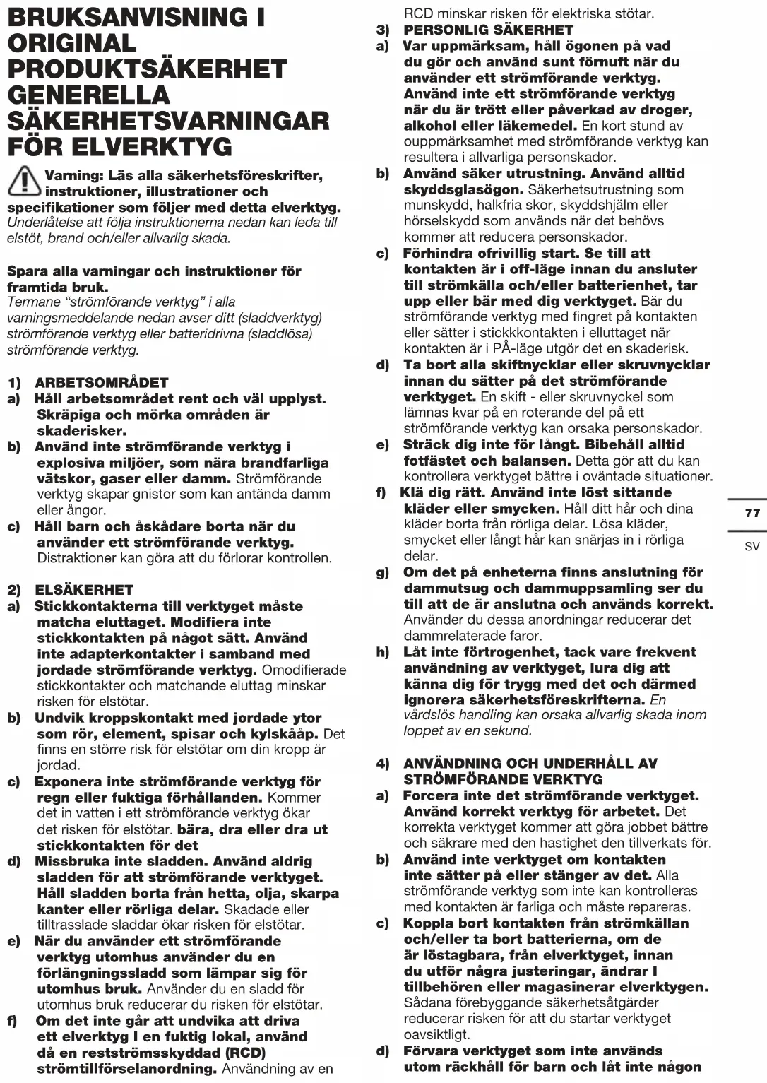 a) Stickkontakterna till verktyget måste matcha eluttaget. Modifiera inte stickkontakten på något sätt. Använd inte adapterkontakter i samband med jordade strömförande verktyg. Omodifierade stickkontakter och matchande eluttag minskar risken för elstötar. b) Undvik kroppskontakt med jordade ytor som rör, element, spisar och kylskååp. Det finns en större risk för elstötar om din kropp är jordad. c) Exponera inte strömförande verktyg för regn eller fuktiga förhållanden. Kommer det in vatten i ett strömförande verktyg ökar det risken för elstötar. bära, dra eller dra ut stickkontakten för det d) Missbruka inte sladden. Använd aldrig sladden för att strömförande verktyget. Håll sladden borta från hetta, olja, skarpa kanter eller rörliga delar. Skadade eller tilltrasslade sladdar ökar risken för elstötar. e) När du använder ett strömförande verktyg utomhus använder du en förlängningssladd som lämpar sig för utomhus bruk. Använder du en sladd för utomhus bruk reducerar du risken för elstötar. f) Om det inte går att undvika att driva ett elverktyg I en fuktig lokal, använd då en restströmsskyddad (RCD) strömtillförselanordning. Användning av en RCD minskar risken för elektriska stötar.
