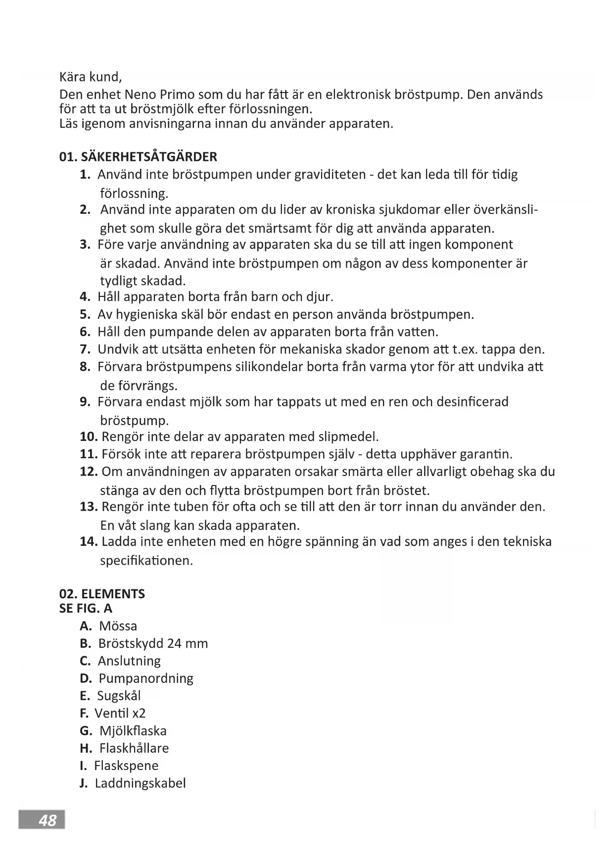 ANVÄNDARMANUAL48 Kära kund, Den enhet Neno Primo som du har få är en elektronisk bröstpump. Den används för a ta ut bröstmjölk eer förlossningen. Läs igenom anvisningarna innan du använder apparaten.