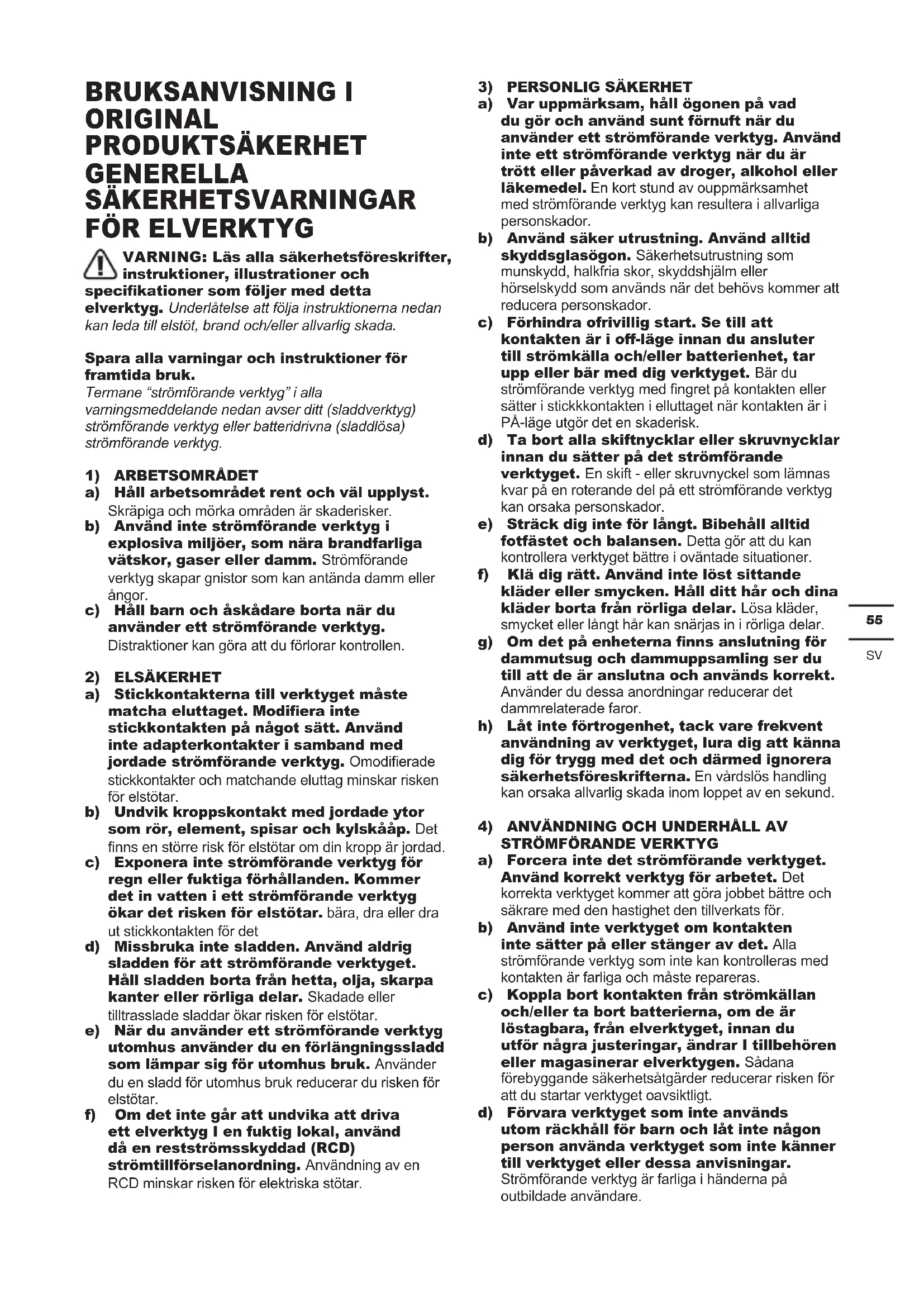 a) Forcera inte det strömförande verktyget. Använd korrekt verktyg för arbetet. Det korrekta verktyget kommer att göra jobbet bättre och säkrare med den hastighet den tillverkats för. b) Använd inte verktyget om kontakten inte sätter på eller stänger av det. Alla strömförande verktyg som inte kan kontrolleras med kontakten är farliga och måste repareras. c) Koppla bort kontakten från strömkällan och/eller ta bort batterierna, om de är löstagbara, från elverktyget, innan du utför några justeringar, ändrar I tillbehören eller magasinerar elverktygen. Sådana förebyggande säkerhetsåtgärder reducerar risken för att du startar verktyget oavsiktligt. d) Förvara verktyget som inte används utom räckhåll för barn och låt inte någon person använda verktyget som inte känner till verktyget eller dessa anvisningar. Strömförande verktyg är farliga i händerna på outbildade användare.56