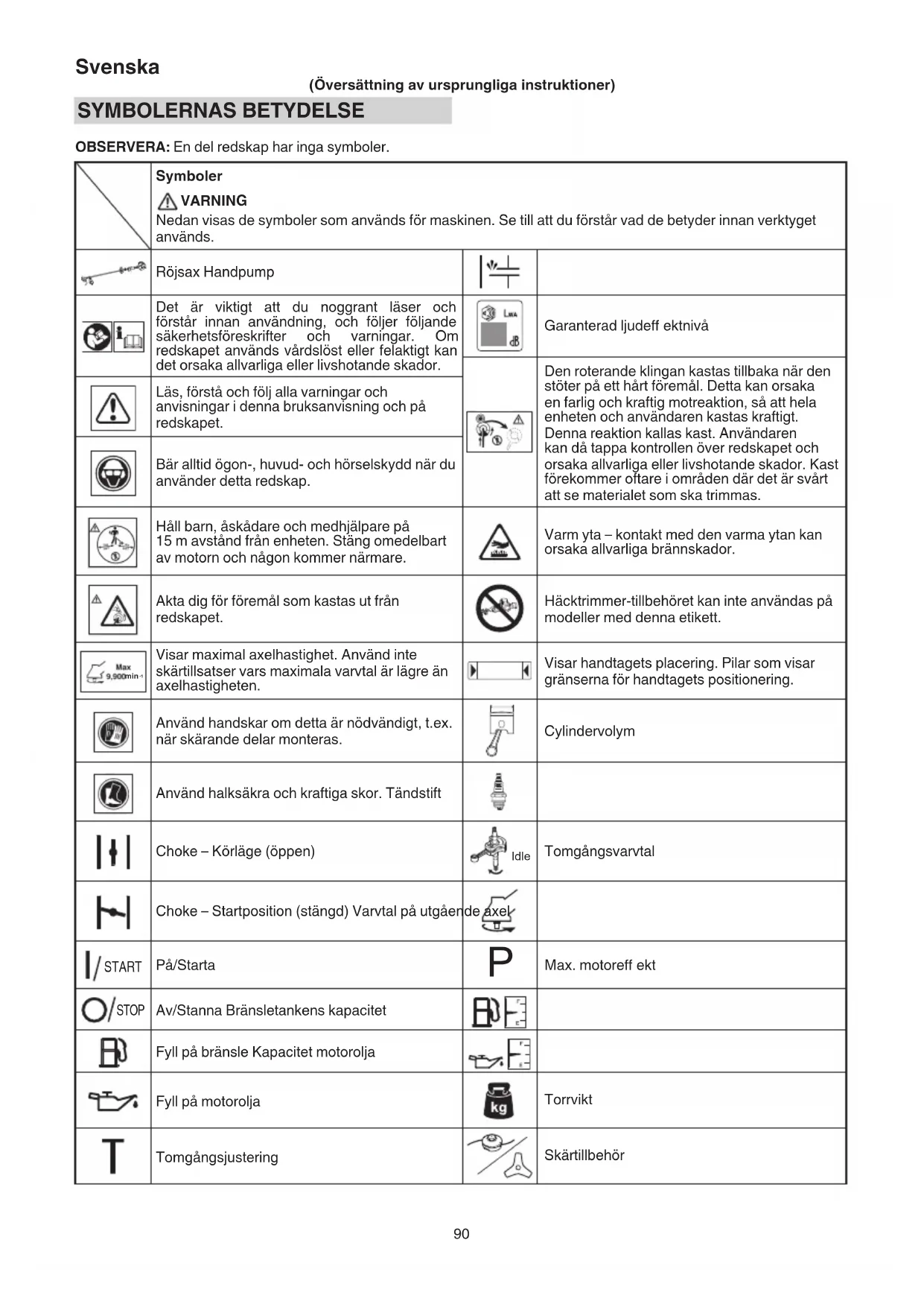 (Översättning av ursprungliga instruktioner) SYMBOLERNAS BETYDELSE OBSERVERA: En del redskap har inga symboler. Symboler VARNING Nedan visas de symboler som används för maskinen. Se till att du förstår vad de betyder innan verktyget används. Röjsax Handpump Det är viktigt att du noggrant läser och förstår innan användning, och följer följande säkerhetsföreskrifter och varningar. Om redskapet används vårdslöst eller felaktigt kan det orsaka allvarliga eller livshotande skador. Garanterad ljudeff ektnivå Den roterande klingan kastas tillbaka när den stöter på ett hårt föremål. Detta kan orsaka en farlig och kraftig motreaktion, så att hela enheten och användaren kastas kraftigt. Denna reaktion kallas kast. Användaren kan då tappa kontrollen över redskapet och orsaka allvarliga eller livshotande skador. Kast förekommer oftare i områden där det är svårt att se materialet som ska trimmas. Läs, förstå och följ alla varningar och anvisningar i denna bruksanvisning och på redskapet. Bär alltid ögon-, huvud- och hörselskydd när du använder detta redskap. Håll barn, åskådare och medhjälpare på 15 m avstånd från enheten. Stäng omedelbart av motorn och någon kommer närmare. Varm yta – kontakt med den varma ytan kan orsaka allvarliga brännskador. Akta dig för föremål som kastas ut från redskapet. Häcktrimmer-tillbehöret kan inte användas på modeller med denna etikett. min
