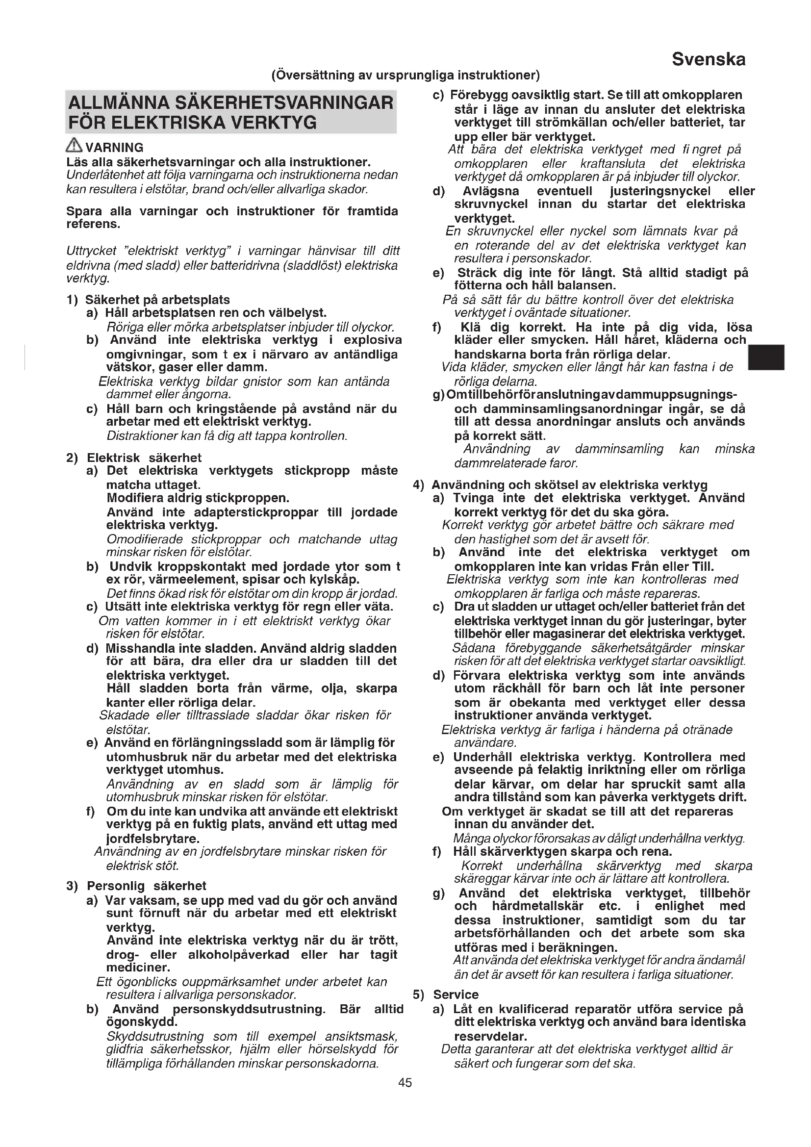 a) Var vaksam, se upp med vad du gör och använd sunt förnuft när du arbetar med ett elektriskt verktyg. Använd inte elektriska verktyg när du är trött, drog- eller alkoholpåverkad eller har tagit mediciner. Ett ögonblicks ouppmärksamhet under arbetet kan resultera i allvarliga personskador. b) Använd personskyddsutrustning. Bär alltid ögonskydd. Skyddsutrustning som till exempel ansiktsmask, glidfria säkerhetsskor, hjälm eller hörselskydd för tillämpliga förhållanden minskar personskadorna. (Översättning av ursprungliga instruktioner) 0000BookG13VE.indb450000BookG13VE.indb45 2017/12/0416:19:472017/12/0416:19:4746 Svenska