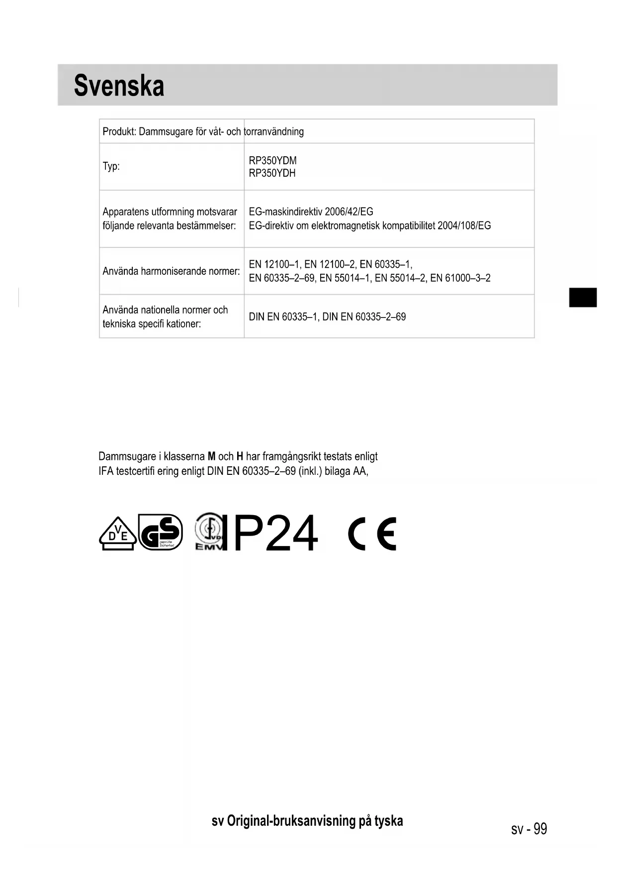 sv Original-bruksanvisning på tyska Produkt: Dammsugare för våt- och torranvändning Typ: RP350YDMRP350YDHApparatens utformning motsvarar följande relevanta bestämmelser:EG-maskindirektiv 2006/42/EGEG-direktiv om elektromagnetisk kompatibilitet 2004/108/EGAnvända harmoniserande normer:EN 12100–1, EN 12100–2, EN 60335–1, EN 60335–2–69, EN 55014–1, EN 55014–2, EN 61000–3–2Använda nationella normer och tekniska specifi kationer:DIN EN 60335–1, DIN EN 60335–2–69Dammsugare i klasserna M och H har framgångsrikt testats enligt IFA testcertifi ering enligt DIN EN 60335–2–69 (inkl.) bilaga AA, Ls IP24 0 Svenska 000BookRP350YDM.indb99000BookRP350YDM.indb99 2019/10/267:31:032019/10/267:31:03100 - sv l FARA! ▶Risk för kvävning ● Förpackningsmaterial som foliepåsar ska inte hamna i barnhänder. ▶Kliv eller sätt dig aldrig på dammsugaren. ▶Var extra försiktig vid dammsugning av trappor. Se till att stå säkert. ▶Dra inte anslutningsledningen och sugslangen över vassa kanter. Böj eller kläm dem inte heller. ▶Lägg alltid anslutningsledningen och sugslangen så att ingen kan snubbla över dem. ▶Uppstår skum- eller vätskeläckage ska du stänga av dammsugaren direkt. ▶Insidan av locket ska alltid hållas torr. ▶Dammsugaren och tillbe”hör får inte tas i drift när: ● dammsugaren har märkbara skador (sprickor/brott), ● nätanslutningsledningen är defekt eller har sprickor resp. blivit för gammal, ● det fi nns misstanke om en osynlig defekt (efter ett fall). ▶Låt inte roterande elborstar komma i kontakt med nätanslutningsledningen. l FARA! ▶Dammsugaren får inte användas i rum där det föreligger explosionsrisk. ▶Håll dammsugaren på avstånd från antändningsbara gaser och ämnen. l FARA! ▶Inga brännbara eller explosiva lösningsmedel, föremål indränkta i lösningsme- del, explosionsfarligt damm, vätskor som bensin, olja, alkohol, förtunnare eller material som är varmare än 60 °C får sugas upp. ▷Då uppstår risk för explosion och brand! l FARA! ▶Låt fackkunniga, t.ex. kundtjänst, genomföra reparationer. Använd endast original-reservdelar. ▶Icke korrekt reparerade apparater innebär en risk för användaren. 000BookRP350YDM.indb100000BookRP350YDM.indb100 2019/10/267:31:032019/10/267:31:03sv - 101