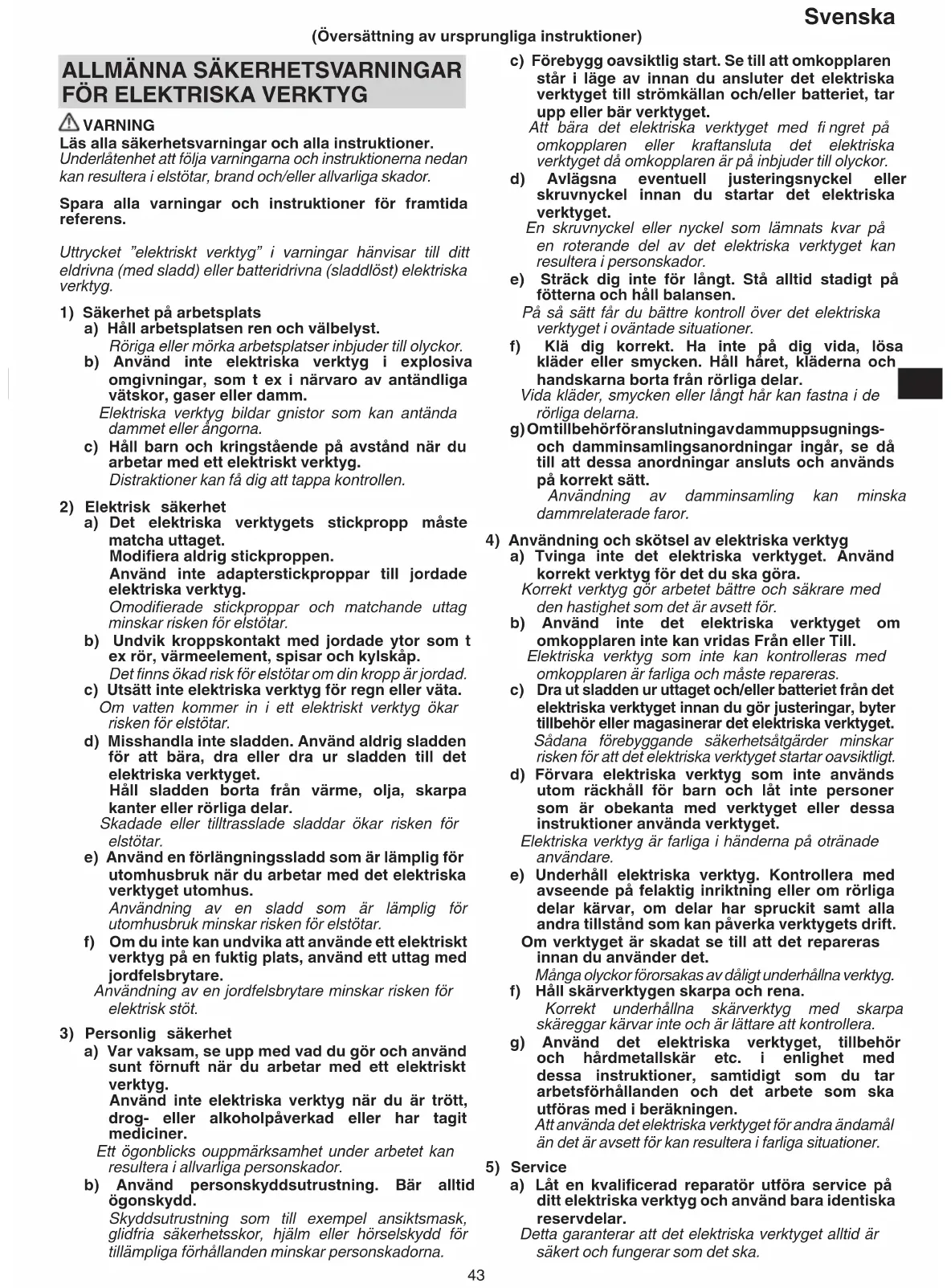 a) Var vaksam, se upp med vad du gör och använd sunt förnuft när du arbetar med ett elektriskt verktyg. Använd inte elektriska verktyg när du är trött, drog- eller alkoholpåverkad eller har tagit mediciner. Ett ögonblicks ouppmärksamhet under arbetet kan resultera i allvarliga personskador. b) Använd personskyddsutrustning. Bär alltid ögonskydd. Skyddsutrustning som till exempel ansiktsmask, glidfria säkerhetsskor, hjälm eller hörselskydd för tillämpliga förhållanden minskar personskadorna. (Översättning av ursprungliga instruktioner) 0000BookG23SU.indb430000BookG23SU.indb43 2017/12/0414:13:272017/12/0414:13:2744 Svenska