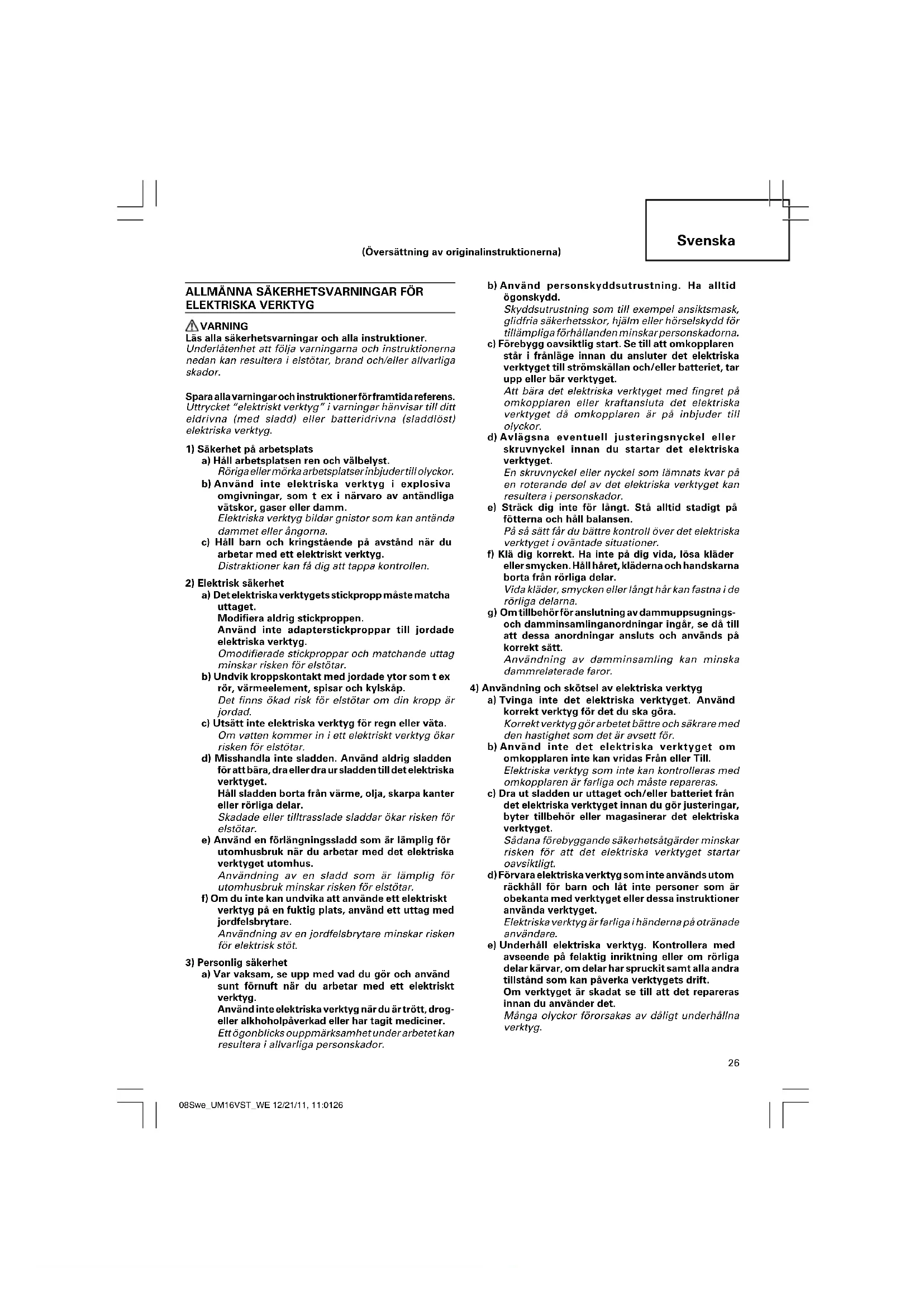 a) Tvinga inte det elektriska verktyget. Använd korrekt verktyg för det du ska göra. Korrekt verktyg gör arbetet bättre och säkrare med den hastighet som det är avsett för. b) Använd inte det elektriska verktyget om omkopplaren inte kan vridas Från eller Till. Elektriska verktyg som inte kan kontrolleras med omkopplaren är farliga och måste repareras. c) Dra ut sladden ur uttaget och/eller batteriet från det elektriska verktyget innan du gör justeringar, byter tillbehör eller magasinerar det elektriska verktyget. Sådana förebyggande säkerhetsåtgärder minskar risken för att det elektriska verktyget startar oavsiktligt. d) Förvara elektriska verktyg som inte används utom räckhåll för barn och låt inte personer som är obekanta med verktyget eller dessa instruktioner använda verktyget. Elektriska verktyg är farliga i händerna på otränade användare. e) Underhåll elektriska verktyg. Kontrollera med avseende på felaktig inriktning eller om rörliga delar kärvar, om delar har spruckit samt alla andra tillstånd som kan påverka verktygets drift. Om verktyget är skadat se till att det repareras innan du använder det. Många olyckor förorsakas av dåligt underhållna verktyg. (Översättning av originalinstruktionerna) 08Swe_UM16VST_WE 12/21/11, 11:0126Svenska