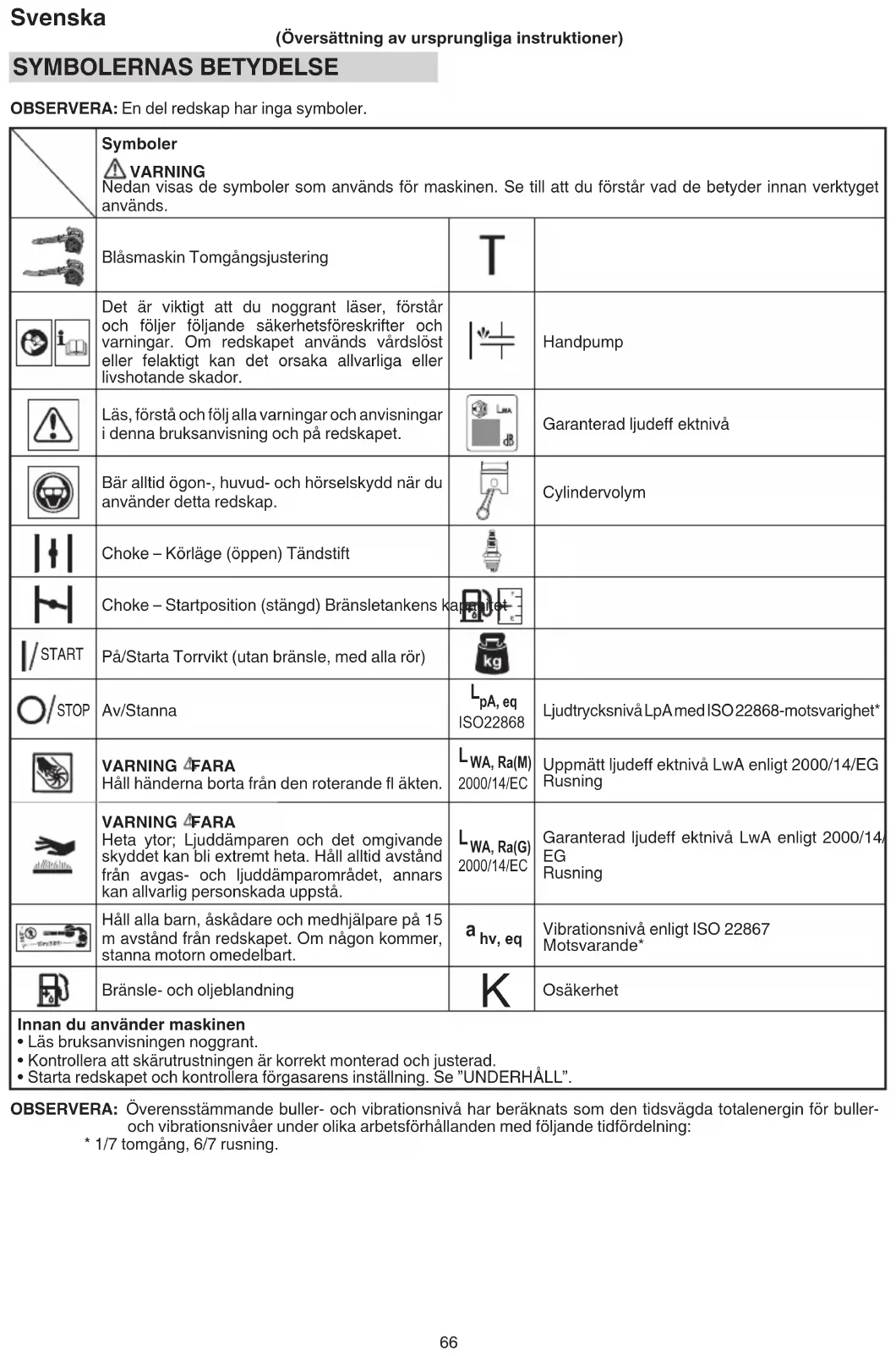 (Översättning av ursprungliga instruktioner) SYMBOLERNAS BETYDELSE OBSERVERA: En del redskap har inga symboler. Symboler VARNING Nedan visas de symboler som används för maskinen. Se till att du förstår vad de betyder innan verktyget används. Blåsmaskin Tomgångsjustering Det är viktigt att du noggrant läser, förstår och följer följande säkerhetsföreskrifter och varningar. Om redskapet används vårdslöst eller felaktigt kan det orsaka allvarliga eller livshotande skador. Handpump Läs, förstå och följ alla varningar och anvisningar i denna bruksanvisning och på redskapet. Garanterad ljudeff ektnivå Bär alltid ögon-, huvud- och hörselskydd när du använder detta redskap. Cylindervolym Choke – Körläge (öppen) Tändstift Choke – Startposition (stängd) Bränsletankens kapacitet START På/Starta Torrvikt (utan bränsle, med alla rör) STOP Av/Stanna